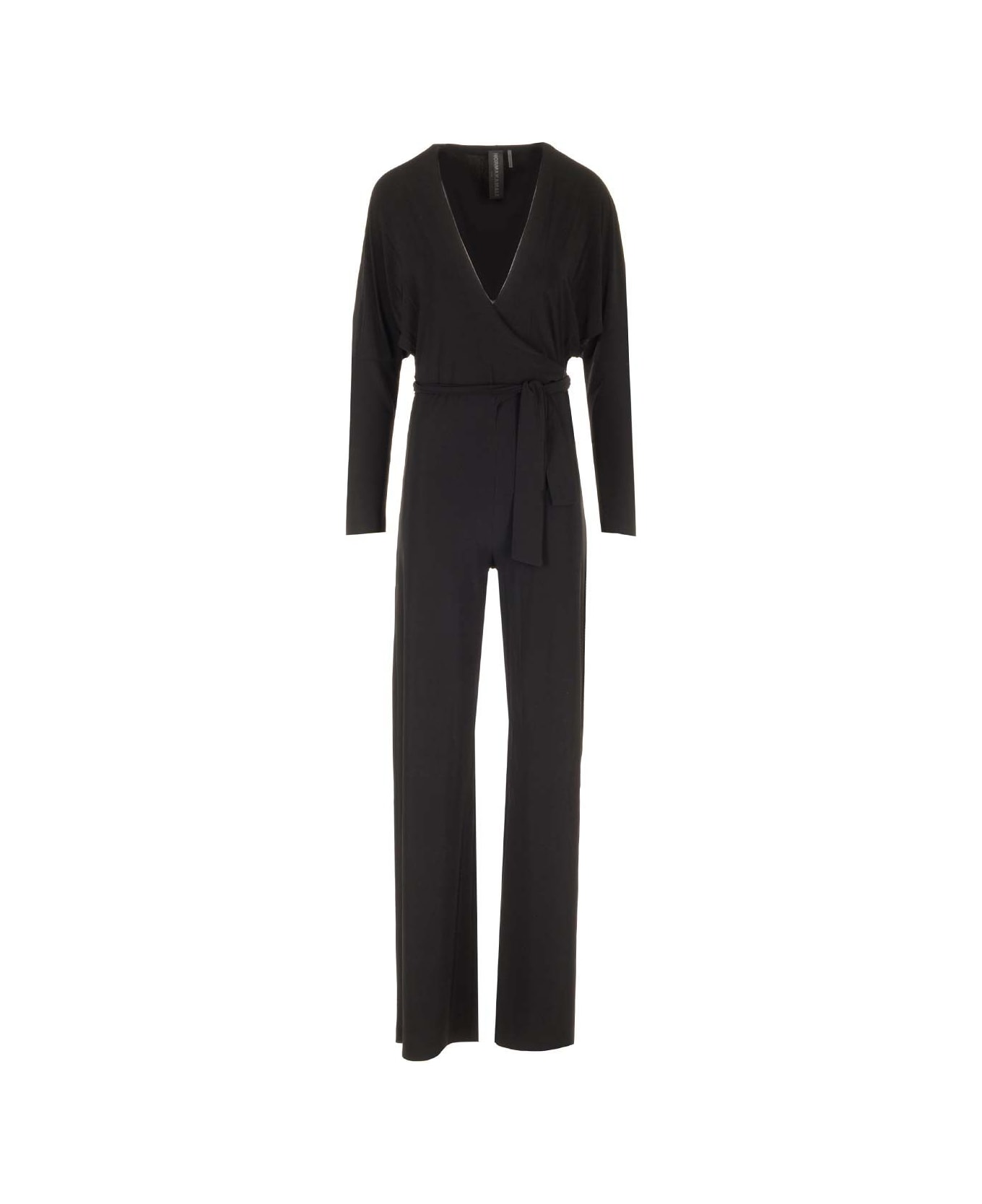 Norma Kamali's "Dolman" jumpsuit in black crepe with deep V-neck, waist strap and leg that falls softly. Composition: 95%PL 5%EA