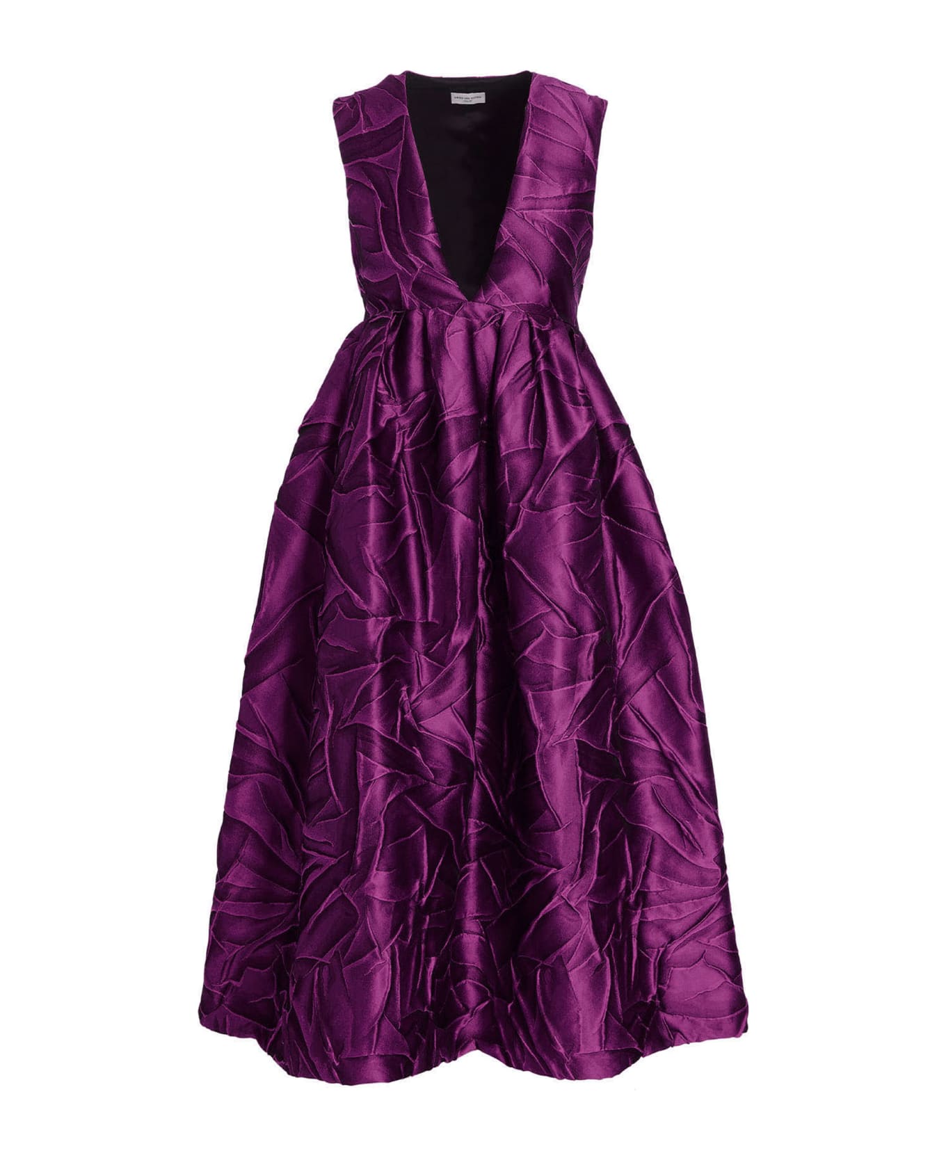 'Doni' textured jacquard sleeveless dress with a V-neck, an irregular pleated style, and a side zip closure.