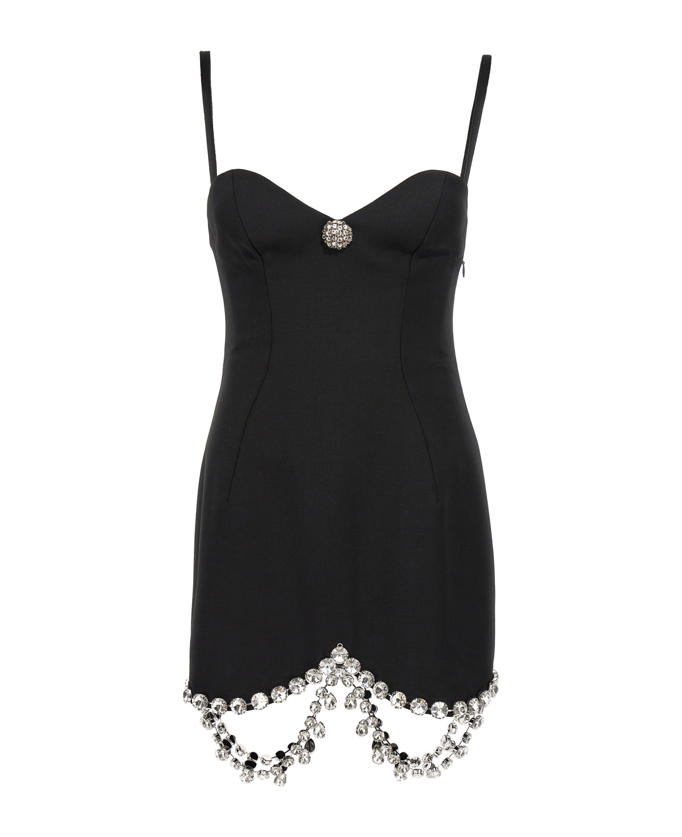 Draped Crystal Mini' wool dress with heart-shaped neckline with crystal appliqués, adjustable thin straps, crystals on the hem, and a side zip closure.