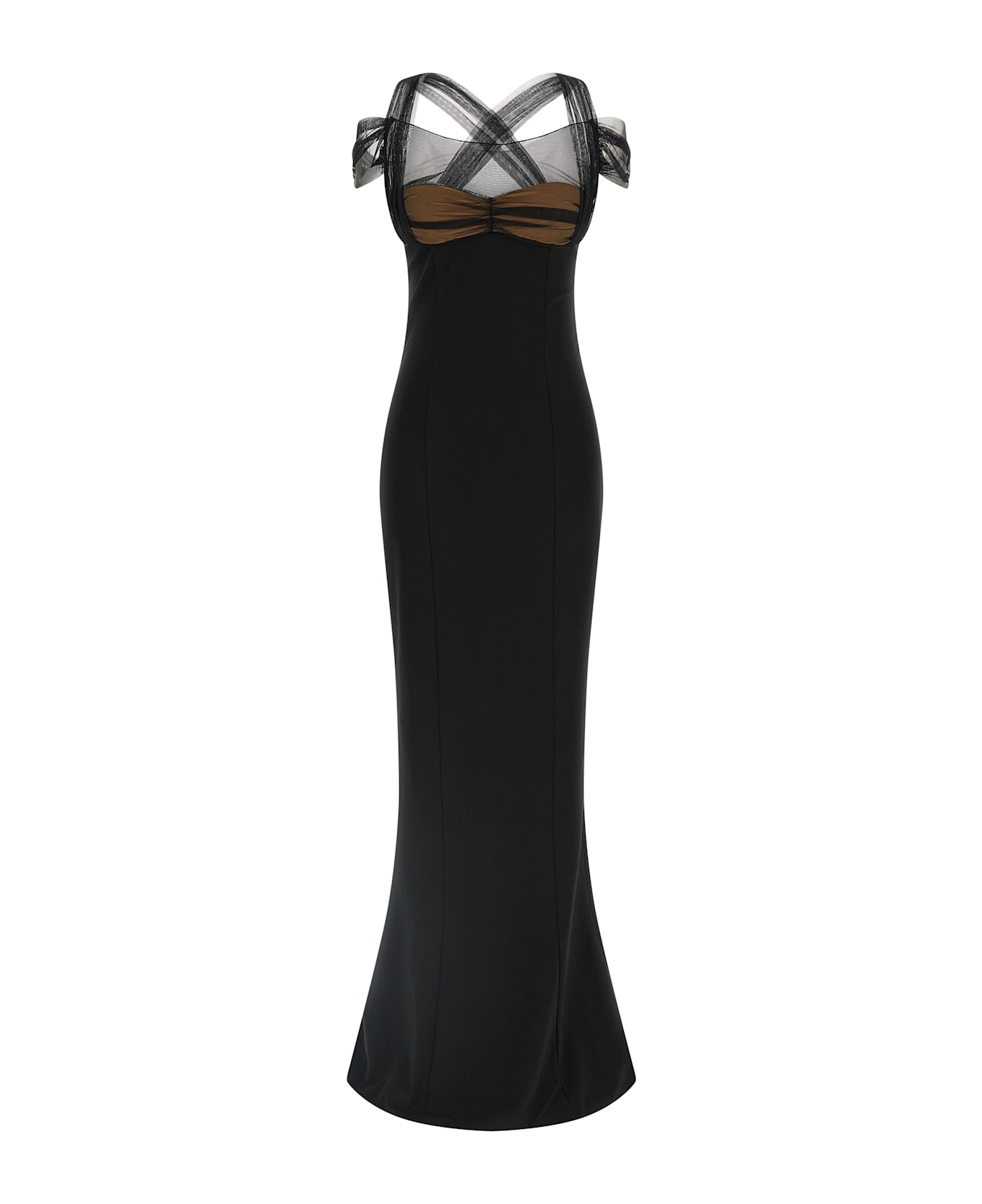 'Draped Padded Cup Maxi' fluid viscose dress with semi-transparent tulle inserts at the top, padded cups, crossed tulle shoulder straps at the back, sleeveless with tulle drapes on the arms, side zip closure, mermaid skirt with back split.
