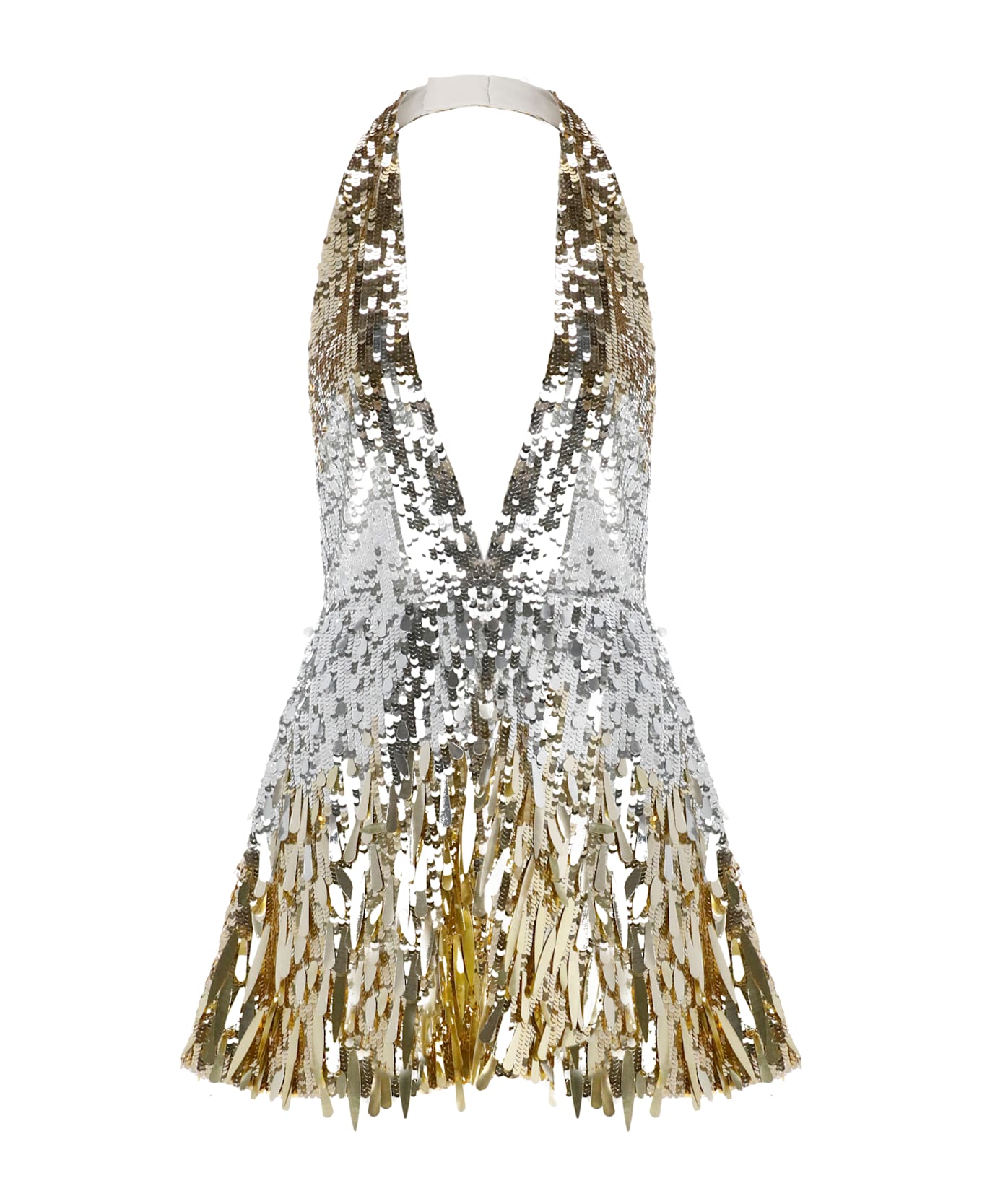 - Gold Retrofete dress for woman - V neck - Sleeveless - Two shoulder straps - All-over paellettes pattern