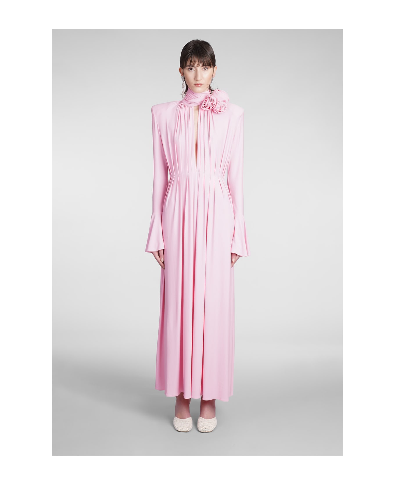 Dress in rose-pink polyamide, long sleeves, flower decoration, high collar with laces, side split, 98% viscose, 2% elastan, model is 180 cm and wears size 40, Made in Poland