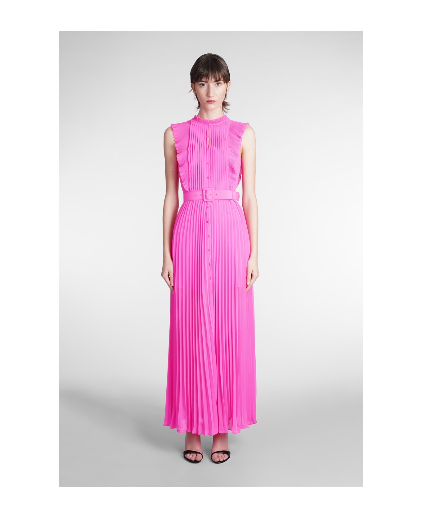 Dress in rose-pink polyester, ruffle neck, ruffles, plissè, belt waist, Made in China, 100% polyester, Model is 178 cm and wears size 8