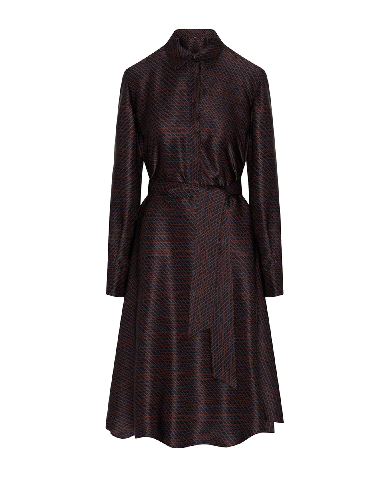 Shirt dress made from luxurious blue silk with a geometric pattern in shades of burgundy and black, entirely cut and sewn in Naples by our master tailors. The flowing lines of the garment are balanced by the pointed collar, long sleeves with double-button cuffs and side pockets set into the seams. The dress is further enhanced by horn buttons and a decorative self belt that can be used as a light scarf if desired. The height of elegance and sophistication, this Kiton dress is perfect for formaloccasions. It speaks to refined women with strong, passionate character, attentive connoisseurs of sartorial traditions. To maintain the beauty of your Kiton garment, we recommend professional laundering and pressing.