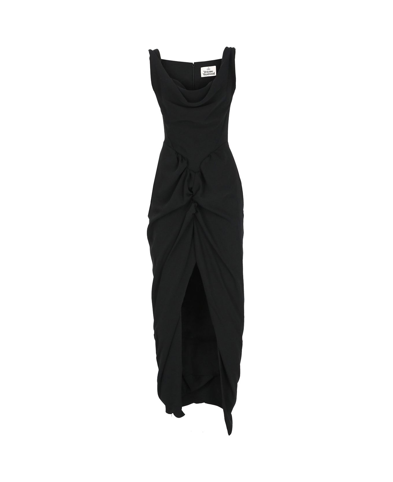 - Black Vivienne Westwood dress for woman - Wide neckline - Rear zip and hook fastening - Sleeveless - Front curled detail - One front vent at hem