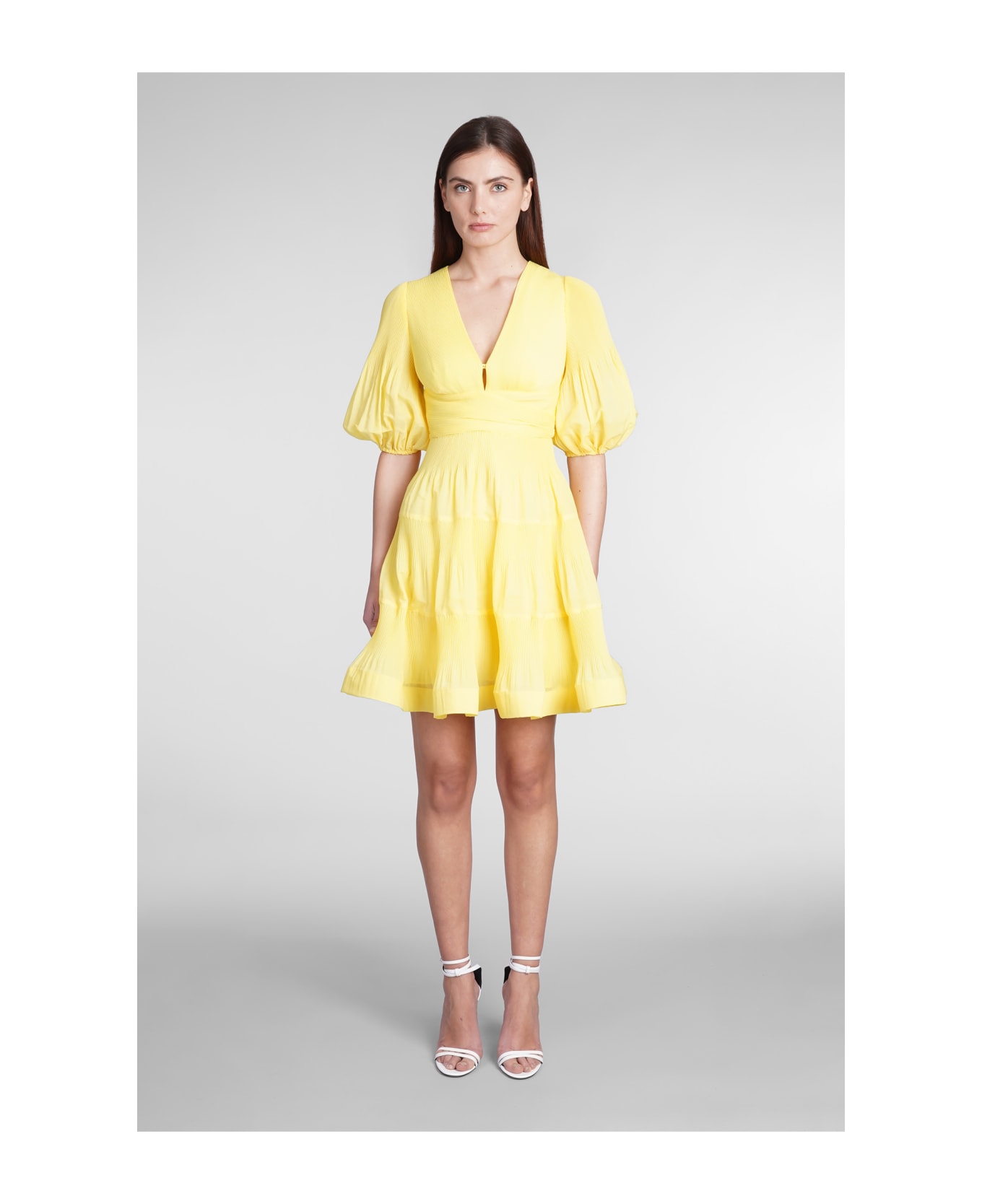 Dress in yellow polyester, V neck, puff sleeves, zip clousure, 100% polyester, Made in China, Model is 180 cm and wears size 0