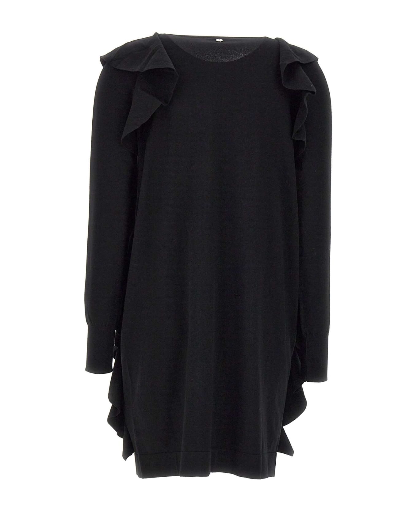 Liu-Jo woman viscose blend dress, black, round neck, ruffles detail on front that personalize garment, high ribbed cuffs, soft line, length below knee, ideal for a feminine look in autumn and winter season.