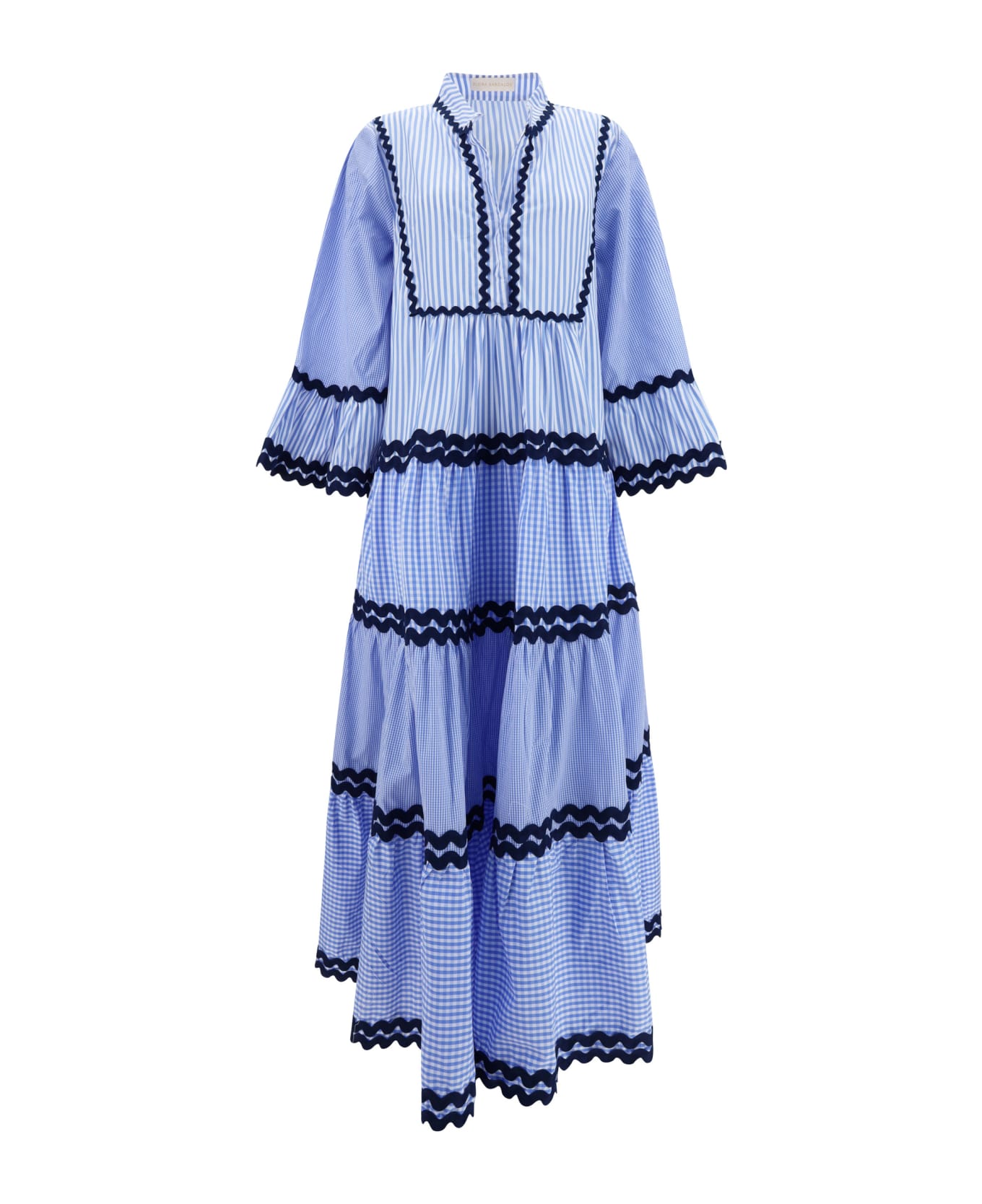 Cotton dress by flora sardalos, chemisier model, v-neck on the front adjustable with hidden buttons, wide bell sleeves, two-tone striped pattern, floor-length model, all-over applied wavy patches.