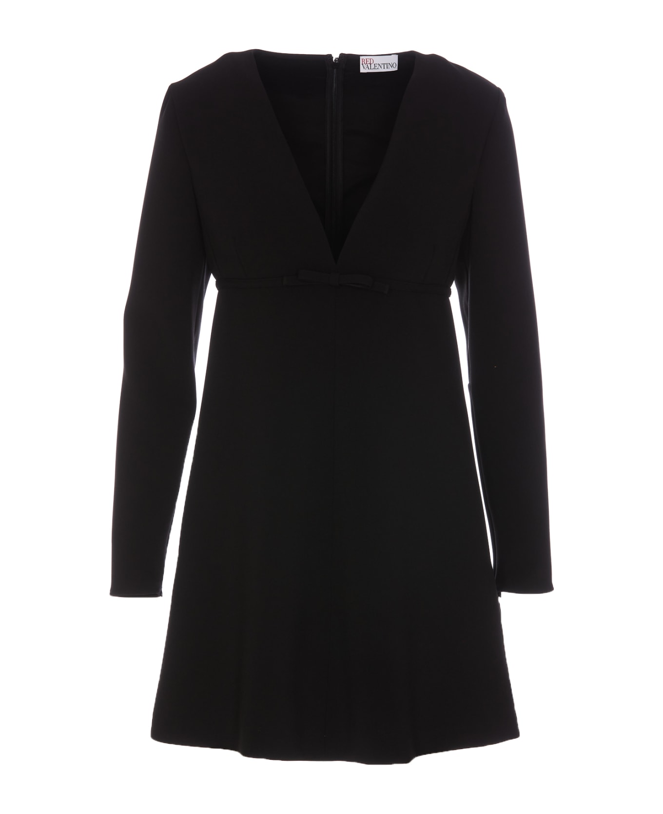 Red Valentino black dress with back zip closure, V-neck, zip detail on sleeves, bow detail on the front, mini model, long sleeves Composition: 93% Polyamide, 7% Elastane