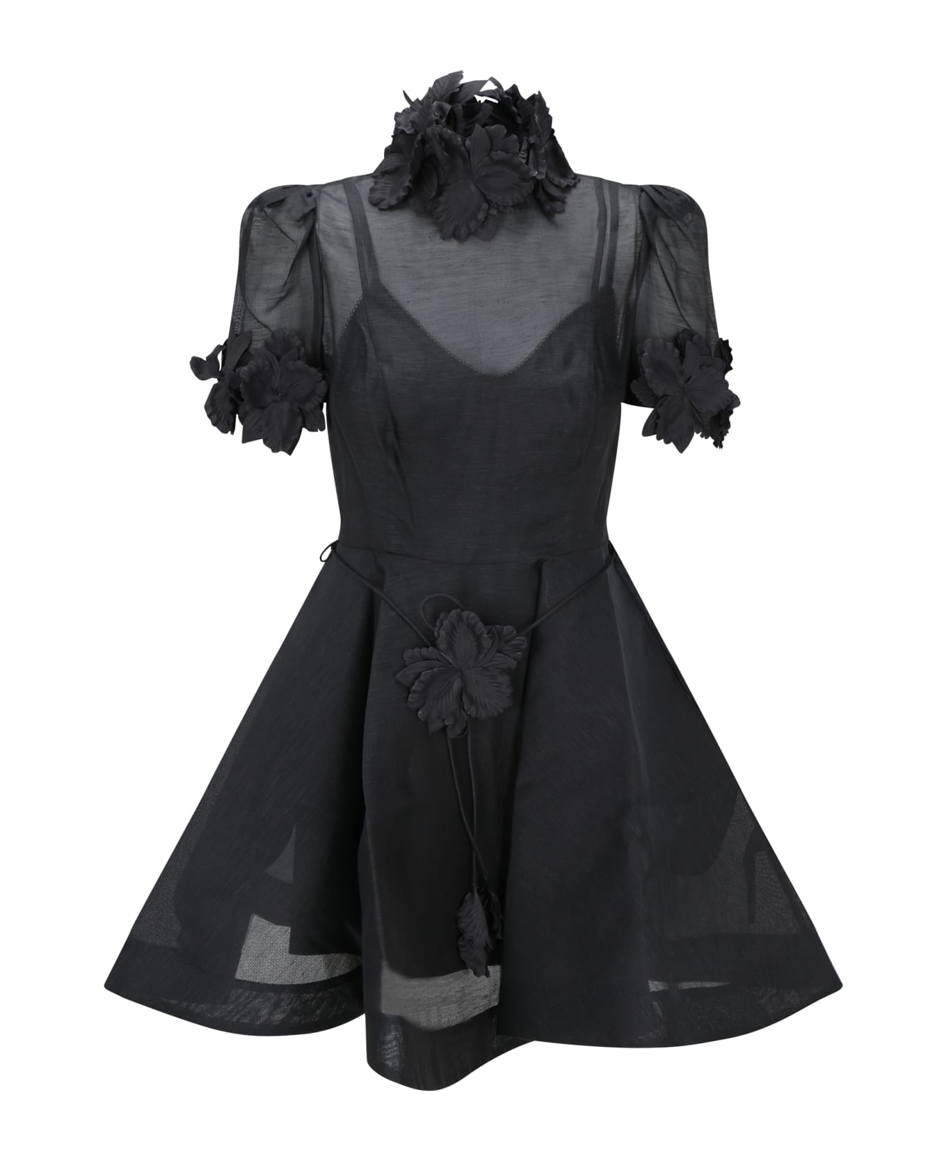 Linen dress by zimmermann, turtleneck embellished with tone-on-tone applied embossed flowers, semi-transparent design with opaque petticoat, puff sleeves with floral detail, waistband with matching floral buckle, back closure by invisible zipper, regular fit.