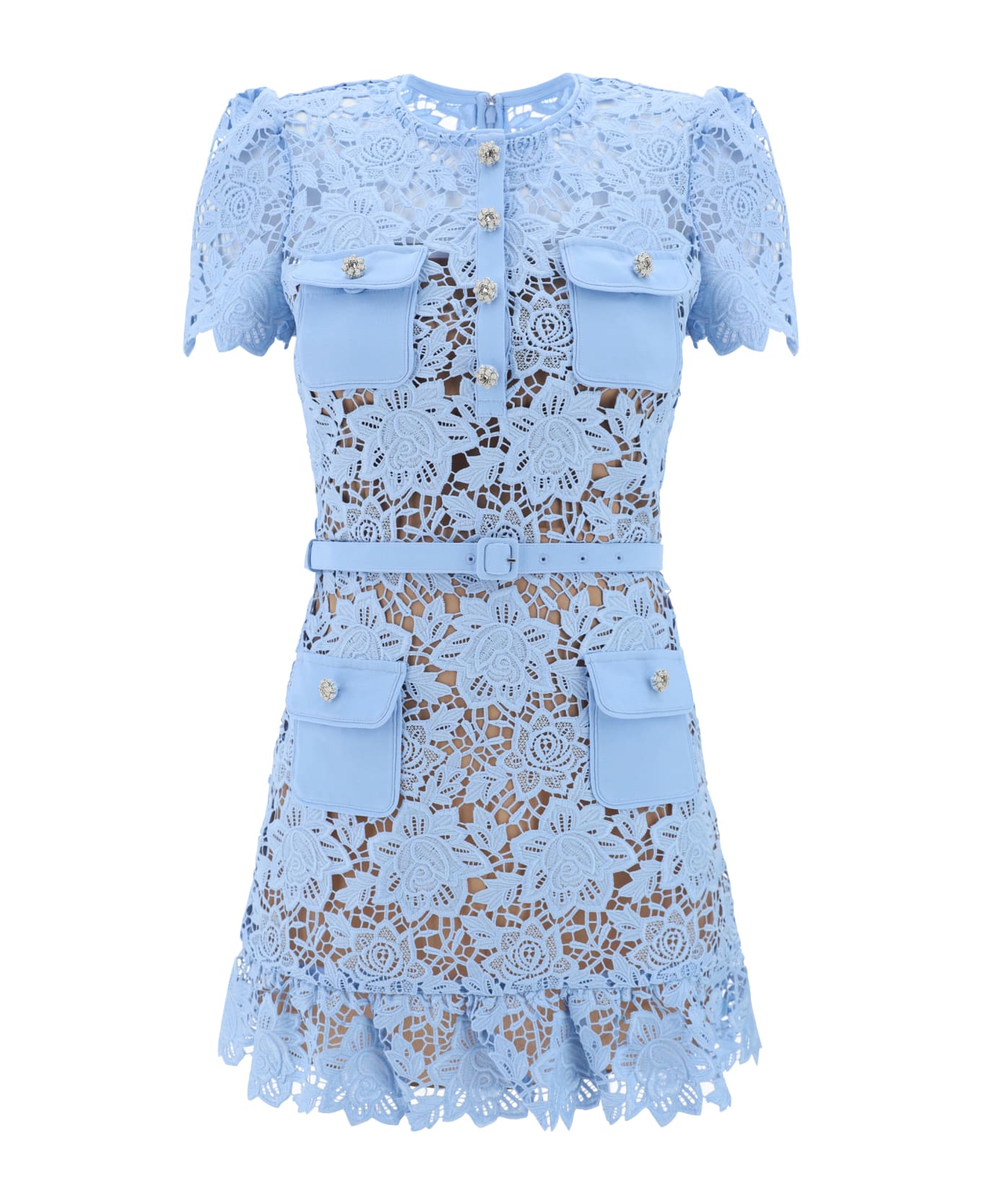 Dress by self-portrait, mini short-sleeve design, zipper and hook-and-eye closure at back, structured design, contrasting button detail applied on front, adjustable and removable waistband, four flap patch pockets on front, monochrome floral lace pattern with perforated details, dress features opaque slip, regular fit.