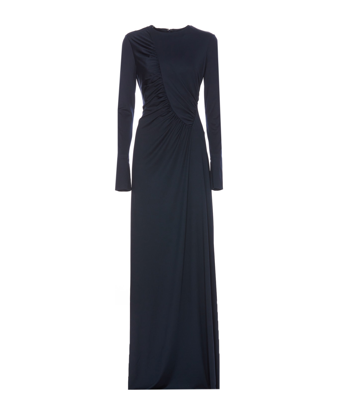 Victoria Bechkam blue ruched detail dress, zip and hook closure on the back, crewneck, long sleeves, elasticized and tight fit, maxi split on the back, long model