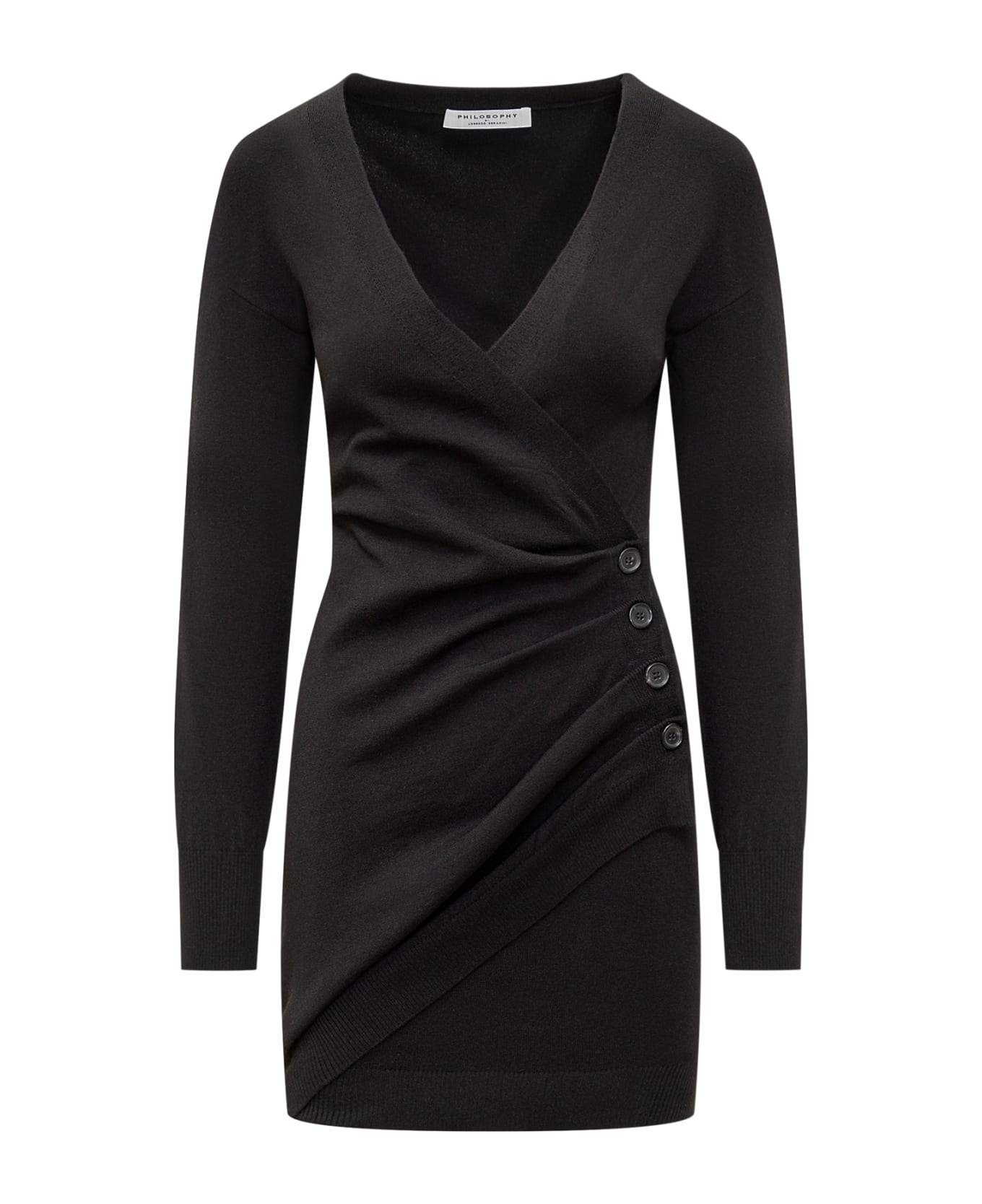 Long-sleeved mini dress in virgin wool blend. Deep V-neck. Ribbed hem. Wallet closure with buttons on the front.
