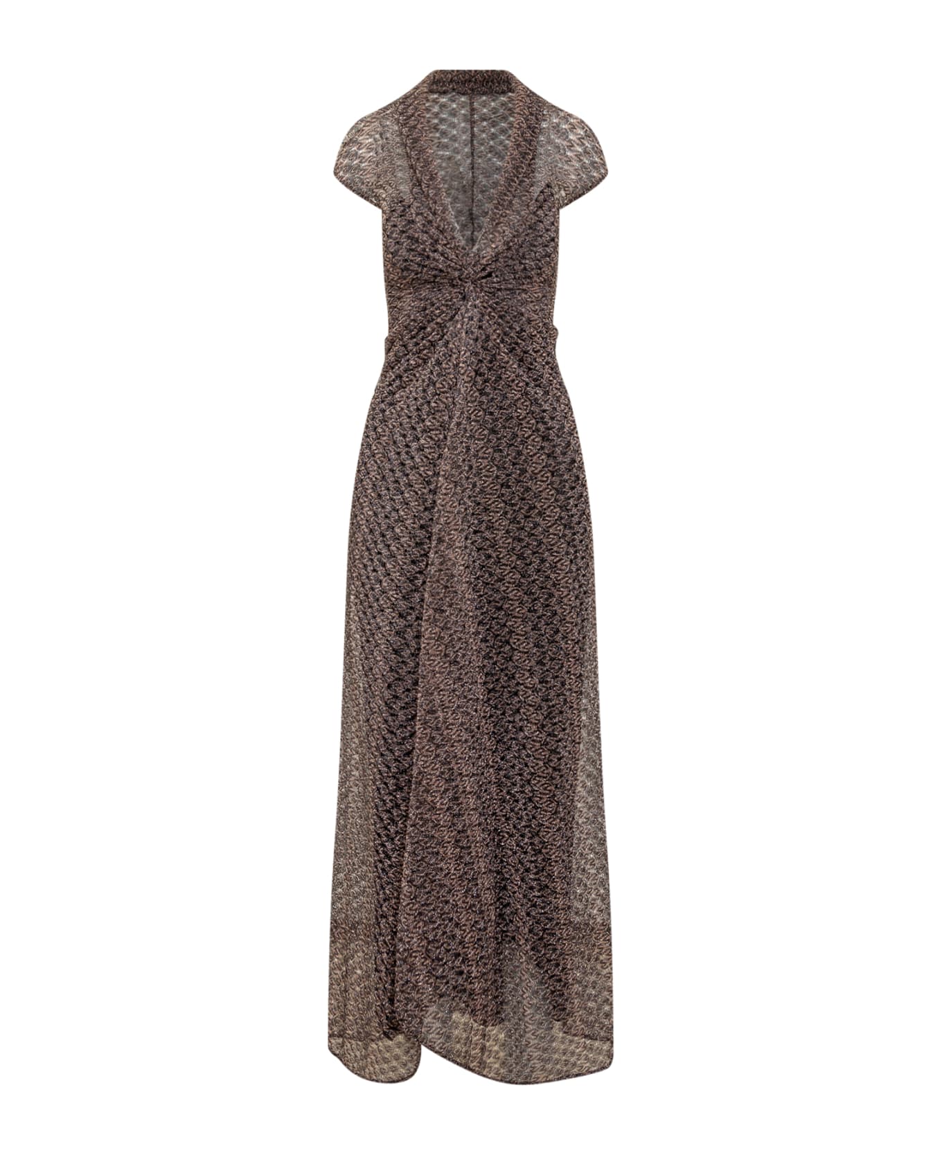 Long short-sleeved dress. Deep V-neck. Ruffled and draped on the front. Metallization. Geometric pattern two-tone all over. Model with petticoat.