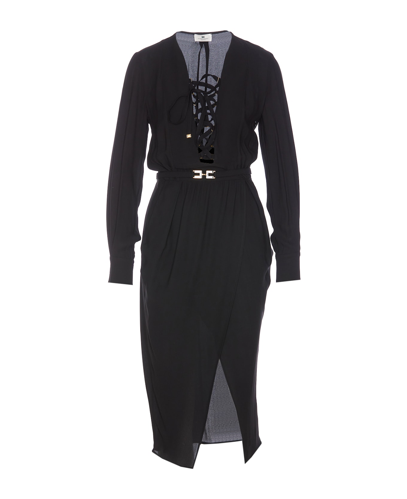 Elisabetta Franchi black dress, v-neck with laces closure, long sleeves, belt on waist, button on cuffs