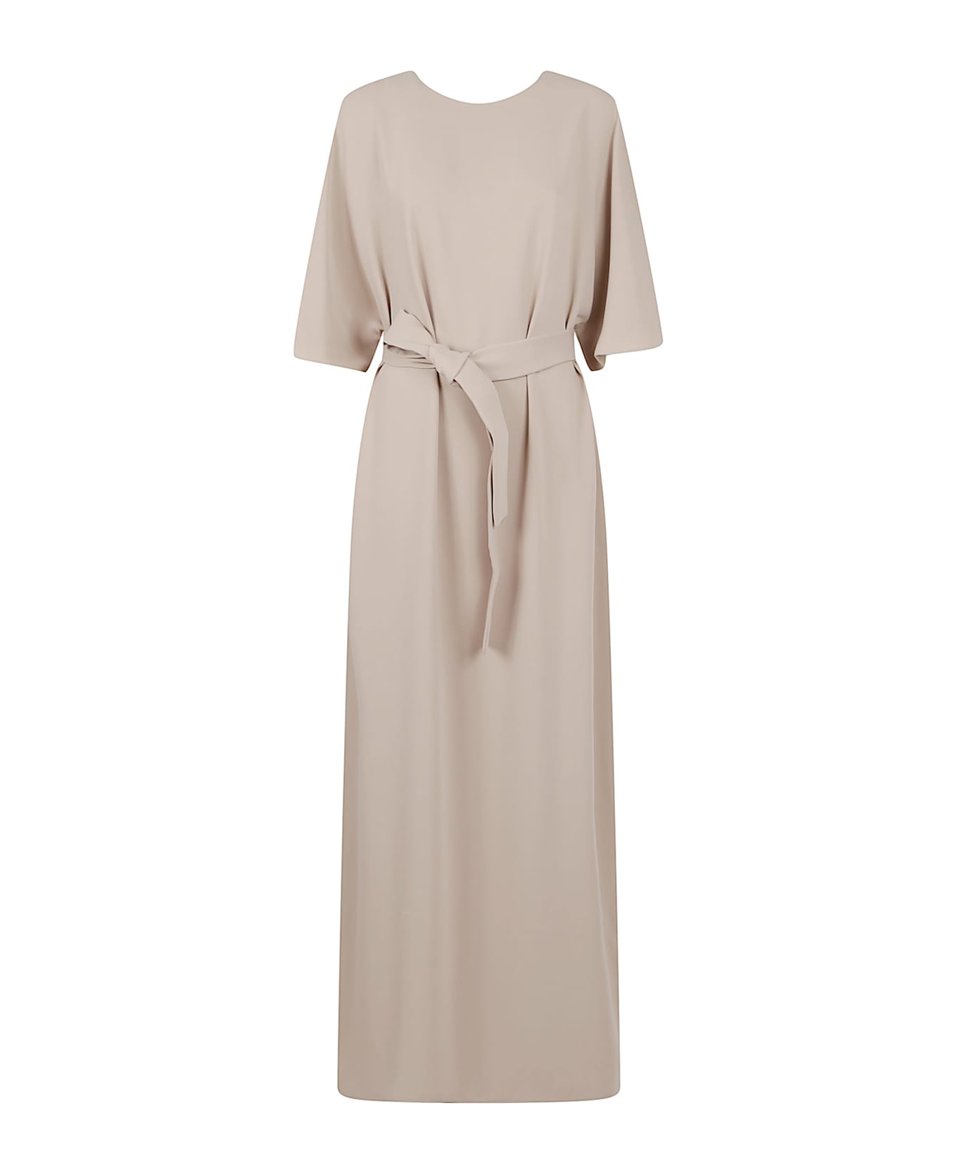 Long cady dress by PAROSH. Crew neck; 3/4 sleeve; long design, relaxed fit and back slit; back keyhole closure with hidden button. Features a belt at the waist.