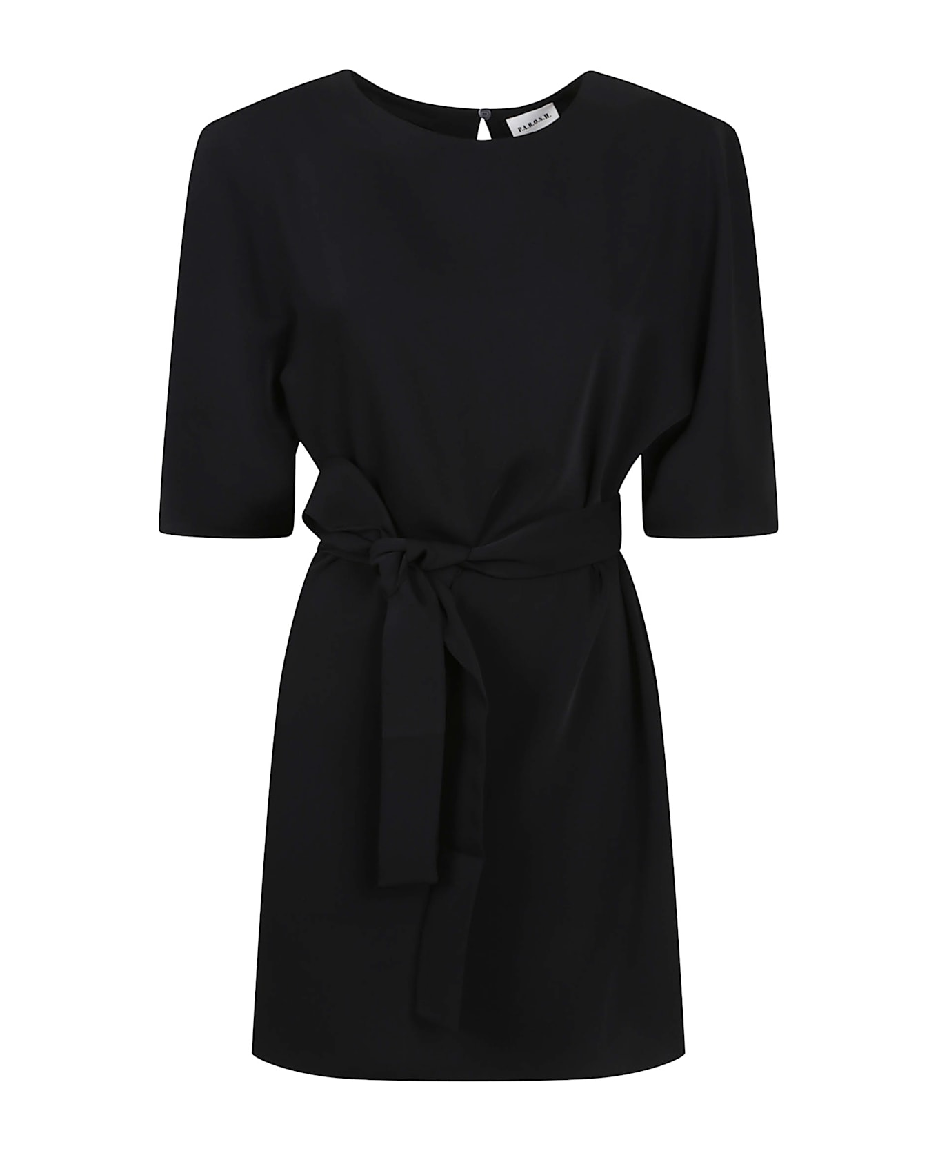 Cady mini dress by PAROSH. Crew neck; half sleeve; hidden button closure. Features a belt at the waist.