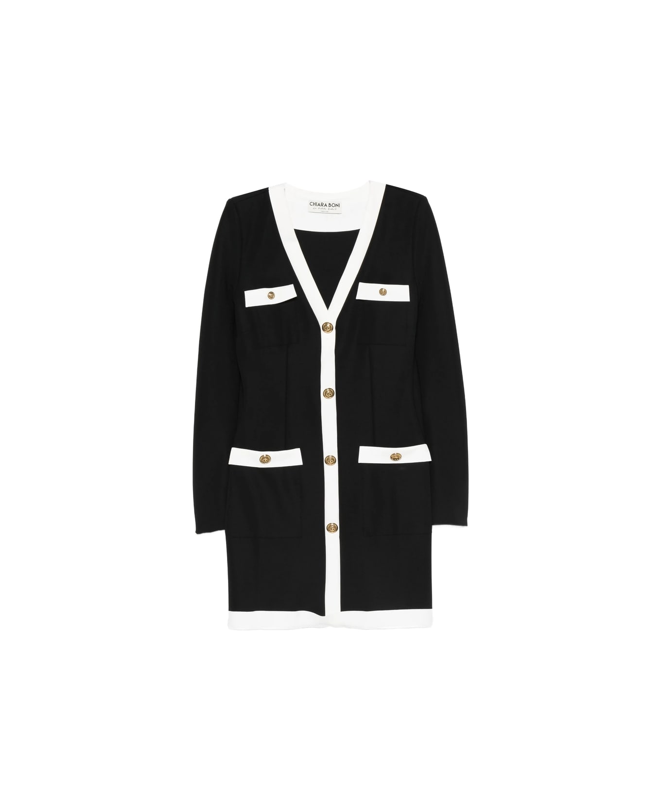 black and white V-neck long sleeves faux-pockets gold-tone button fastening