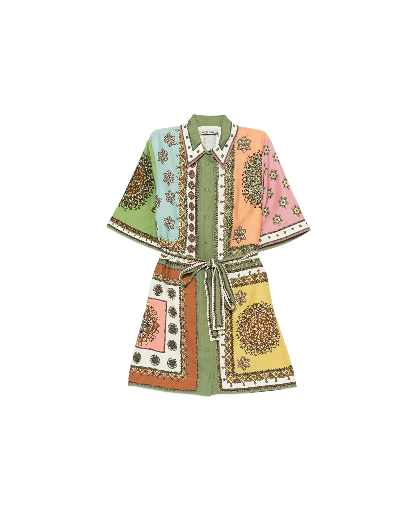 green multicoloured floral print button fastening belt short sleeves classic collar