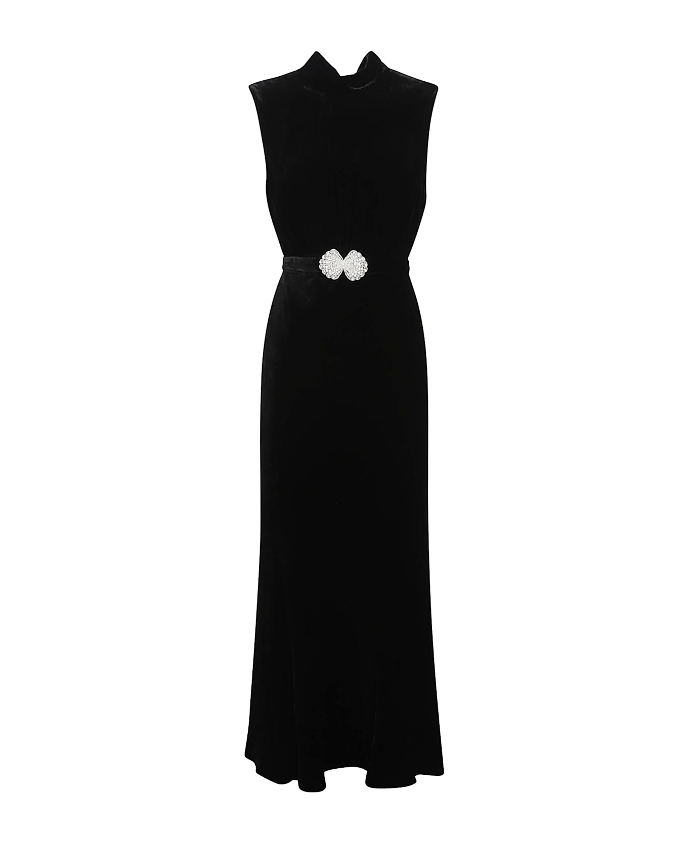 Long velvet dress High collar with bow closure on the back Lined Sleeveless Pearl and rhinestone inserts on the supplied belt Colour: black Composition: 82% rayon, 18% silk