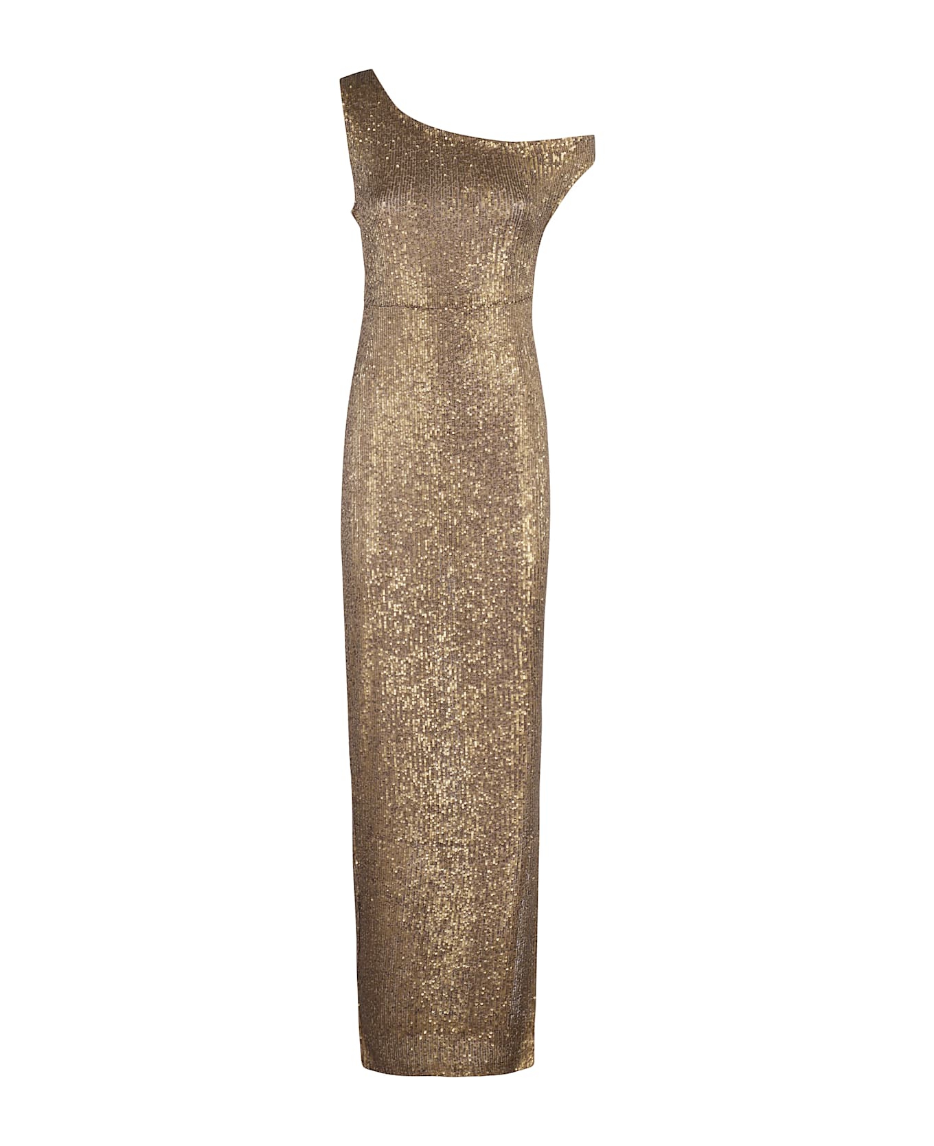 Drop dress - Norma Kamali - Bronze color - Stretch fabric with all-over sequins - Asymmetrical neckline with dropped shoulder - Wide side slit - Fitted fit