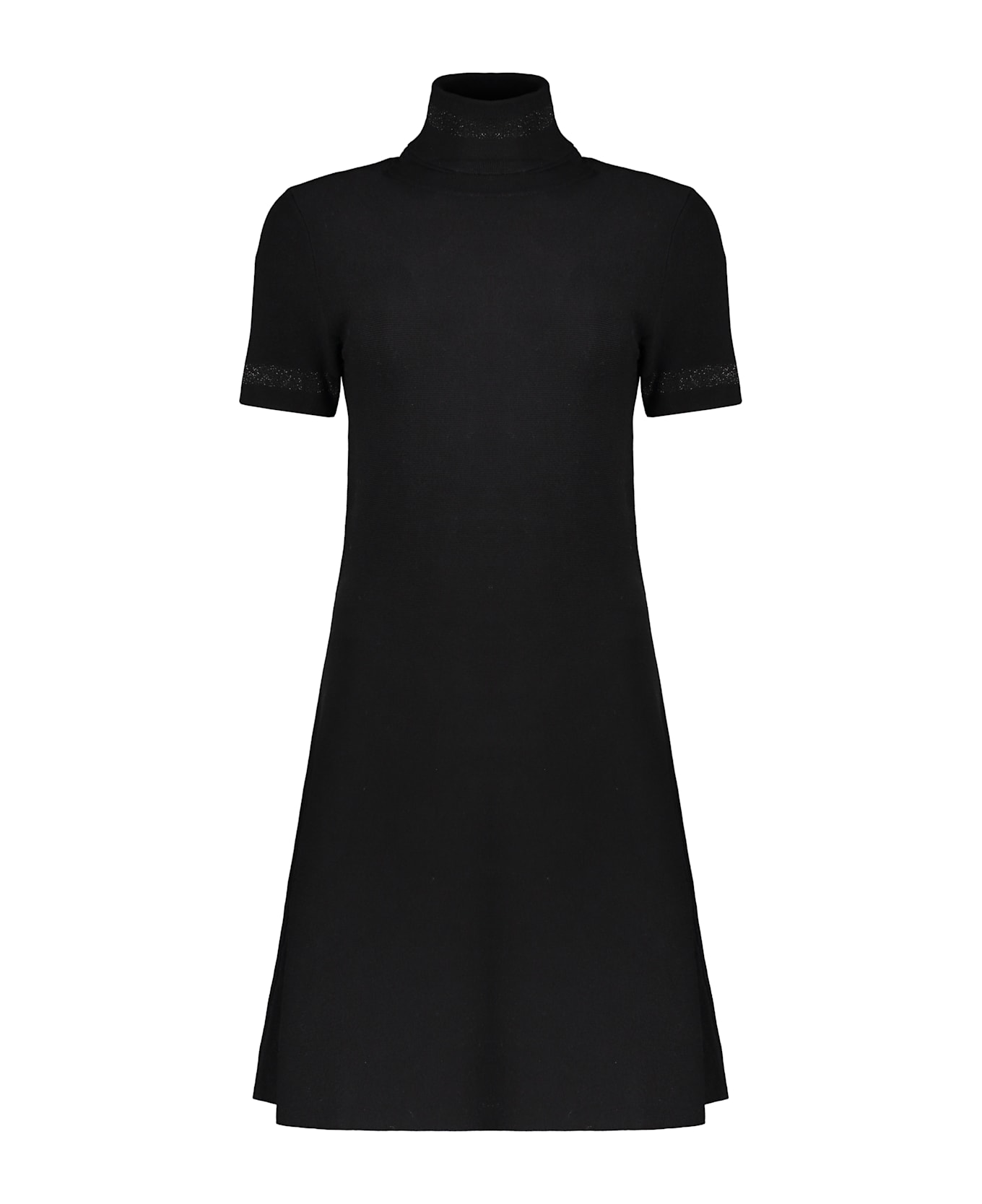 Women's short-sleeve dress, made of elegant black fabric. the design features a high collar and a flared silhouette that reaches above the knee. ideal for casual and formal occasions, this versatile dress can be easily paired with various accessories and footwear to create distinctive looks. available in various sizes.