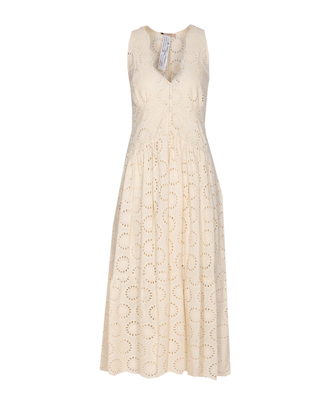 Twinset cream embroidered dress, buttons closure, v-neck, belt on waist, midi model, sleveless Composition: 100% Cotton