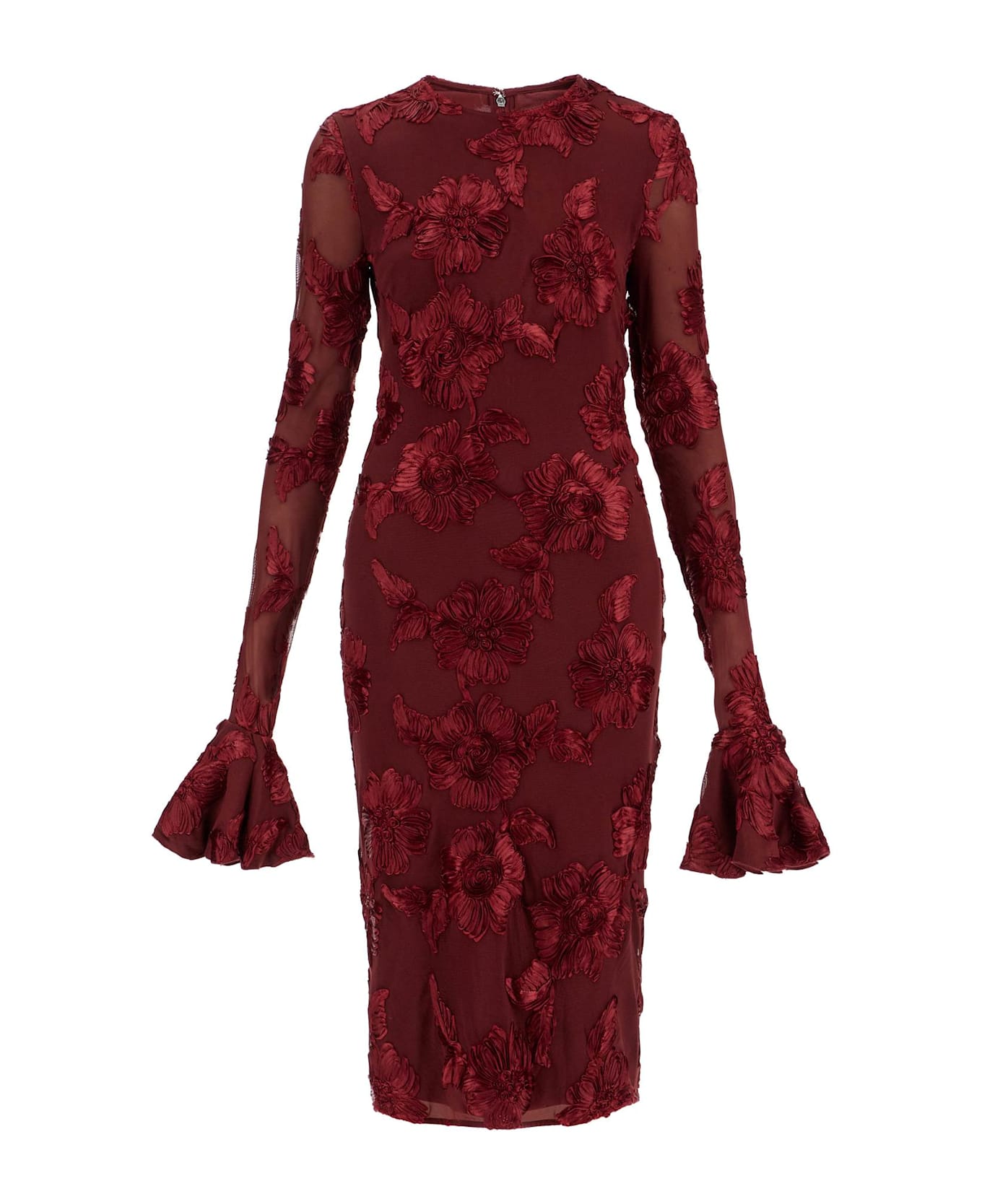 This midi dress by Rotate is made of mesh lined with jersey and embellished with tone-on-tone embroidered flowers all over. It features a fitted silhouette with a round neckline and long sleeves adorned with ruffled cuffs. The invisible zip closure at the back has a monogrammed pull tab. The model is 177 cm tall and wears an EU size 36.