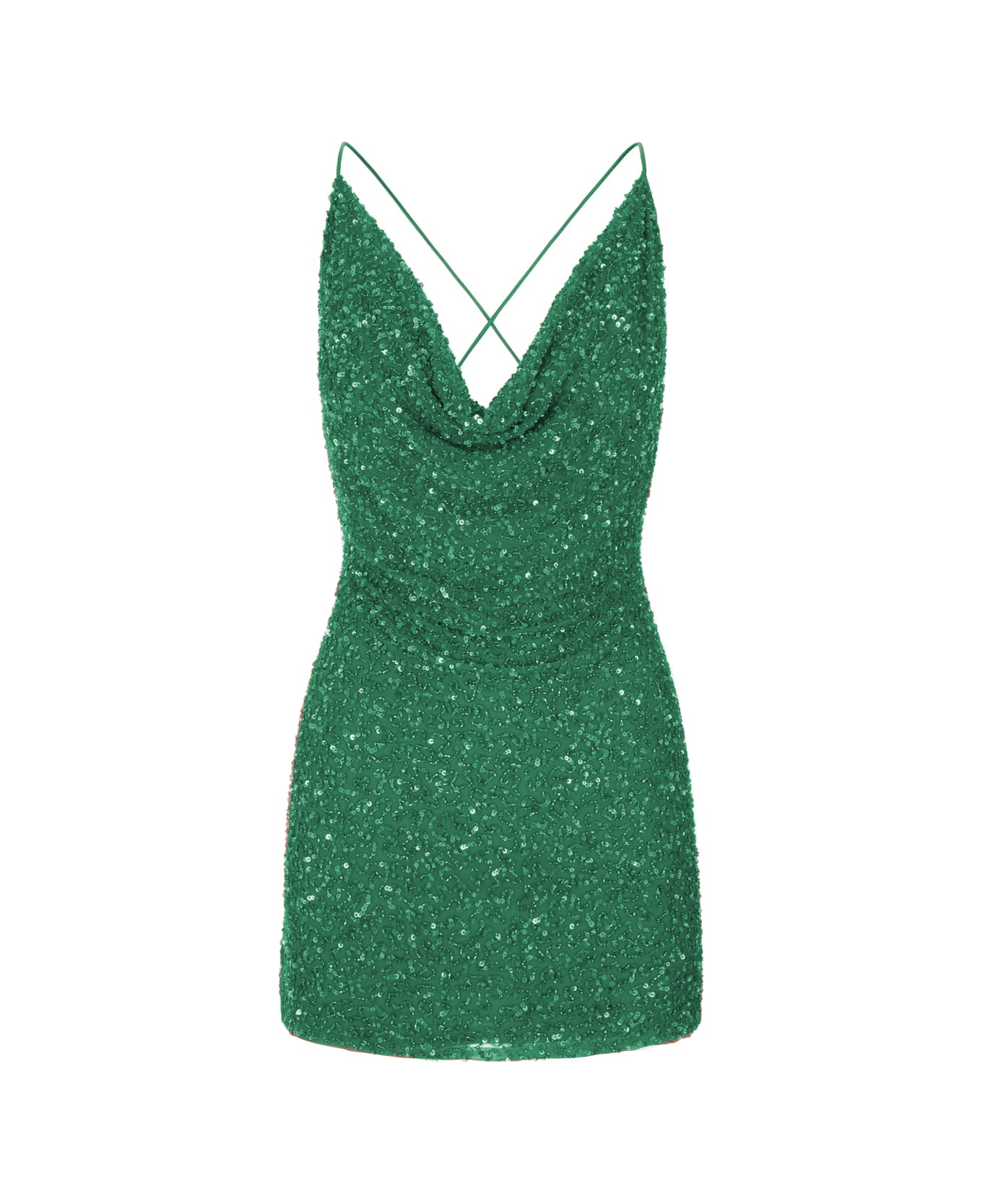 Bright Emerald green Mich mini dress by Retrofete entirely embroidered with sequins and featuring thin straps, a tight fit, an open back and a cowl neckline.
