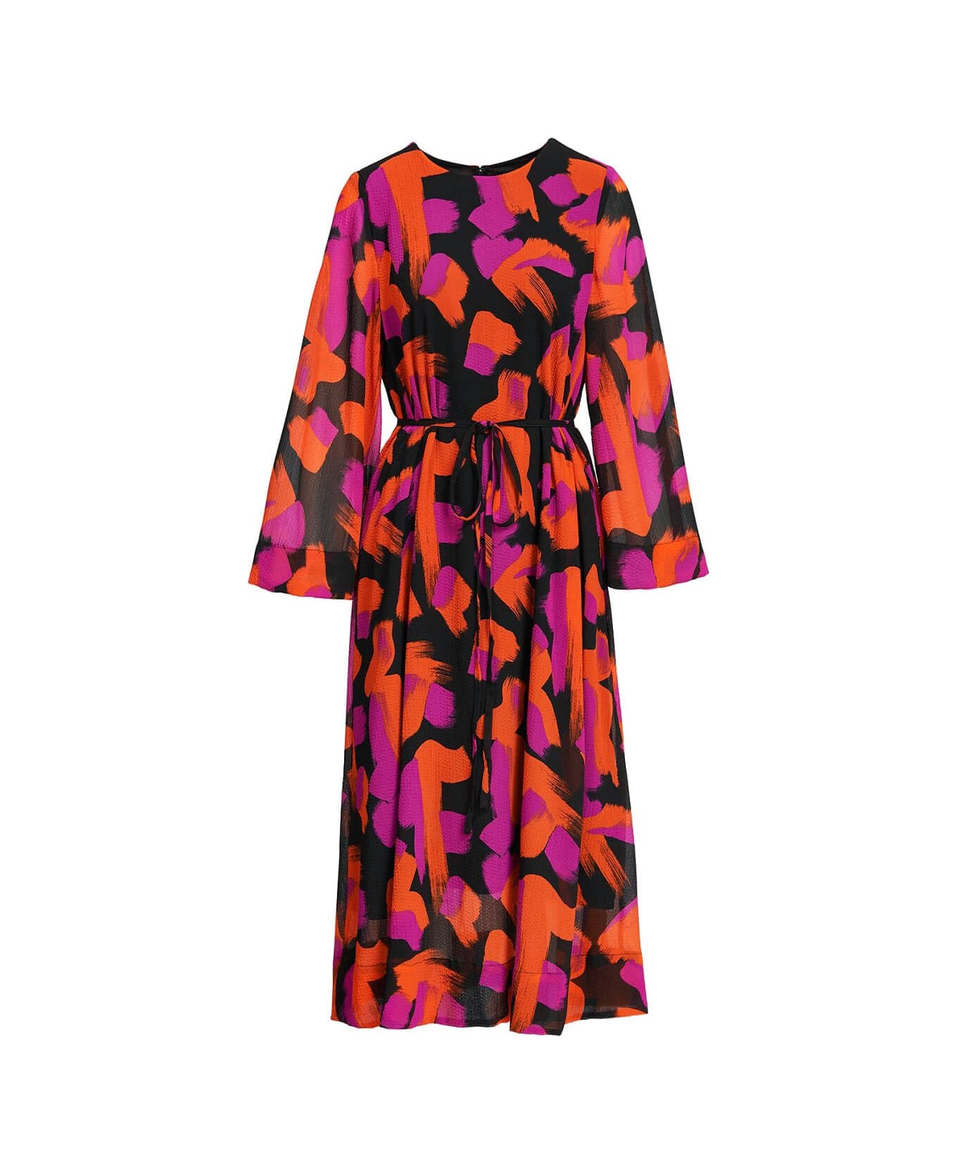 Cartwheel dress by Essentiel Antwerp made of recycled polyester with abstract pattern in shades of black, orange and purple. Matching belt to tie at the waist, viscose lining. Hidden zip closure on the back. Loose fit. The model is 180 cm tall and wears size S.