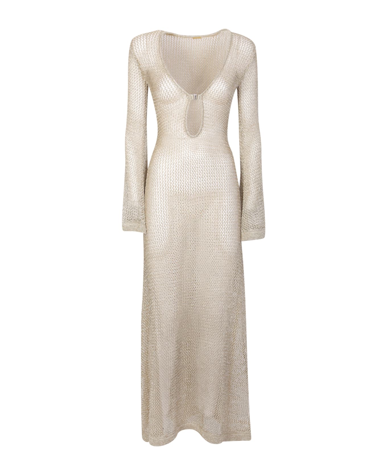 Metallic threading. Plunge style. Long sleeves. Ankle-length. Mesh detailing. Color: Gold