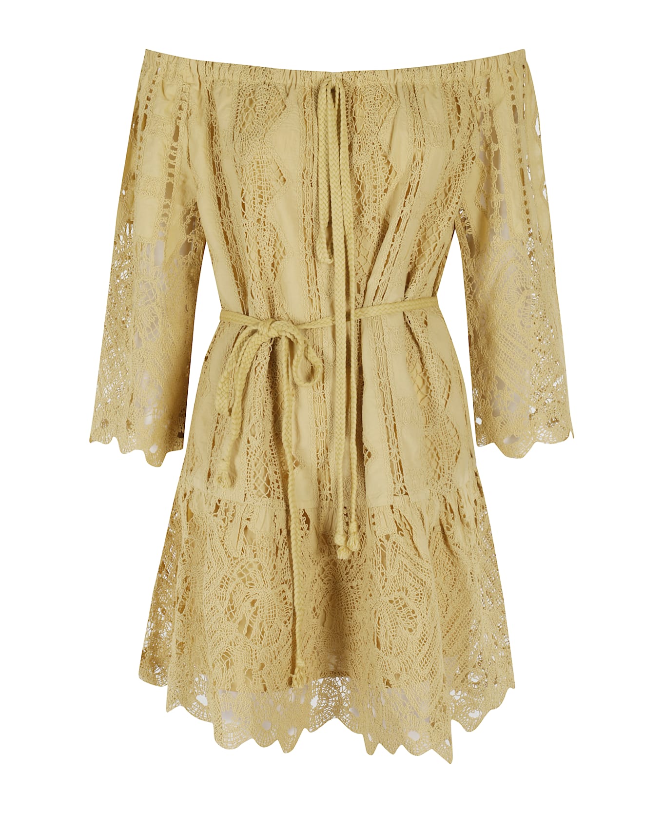 Evergreen dress - Pinko - Yellow color - Sangallo lace fabric - Elasticized off-shoulder neckline - 3/4 sleeve - Removable waist belt - Scalloped hem miniskirt - Loose fit