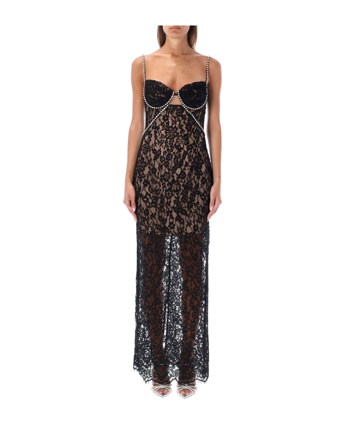 Fine Lace Maxi Dress By Self Portrait. Featuring: Sheer Fine Lace Lingerie-inspired Top Diamanté Straps At Shoulders, Cups And Waist Cut-out Bodice Rear Zip Fastening Fitted Model Is 1,72m Tall And She Is Wearing Size 8