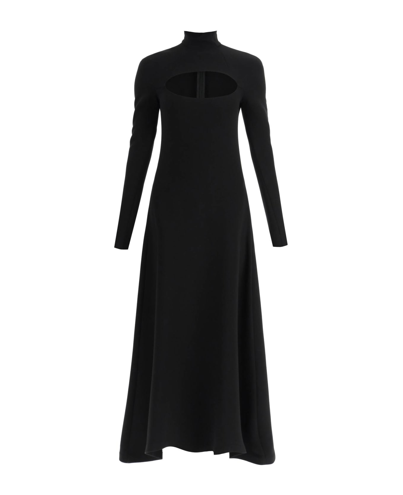 A. w. a. k. e. Mode long dress made of stretch viscose-blend twill featuring a slim cut with asymmetrical flared skirt. High-neck design with elongated flared sleeves and oval cut-out at the chest. Finished with rear invisible zip fastening. The model is 177 cm tall and wears a size FR 36.