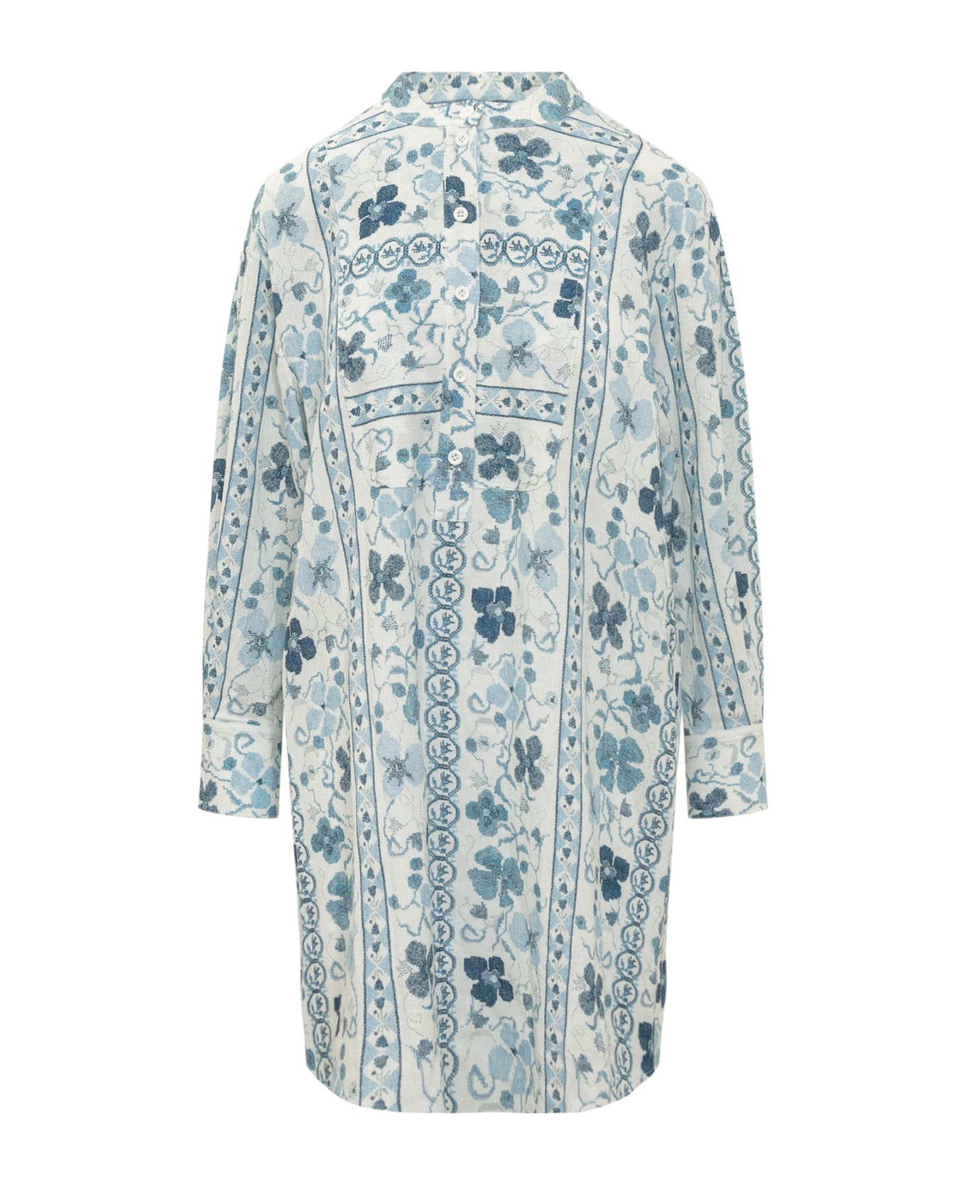 Midi dress with long sleeves. Stand-up collar. Button closure on the front. Cuffs with buttons. All-over floral cross-stitch print.