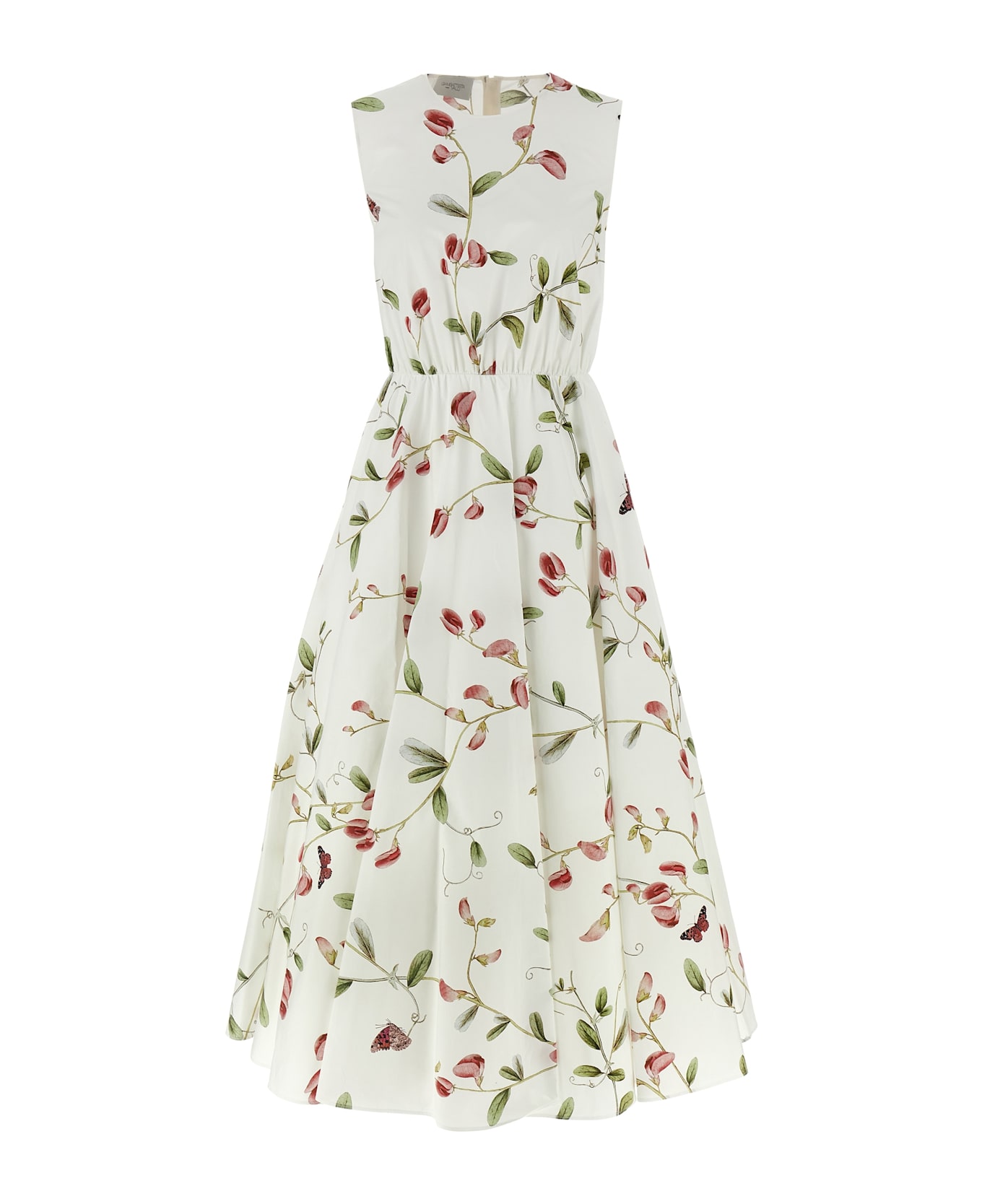 Long dress in floral print cotton, sleeveless crewneck, gathered waist, back zip and hook closure.
