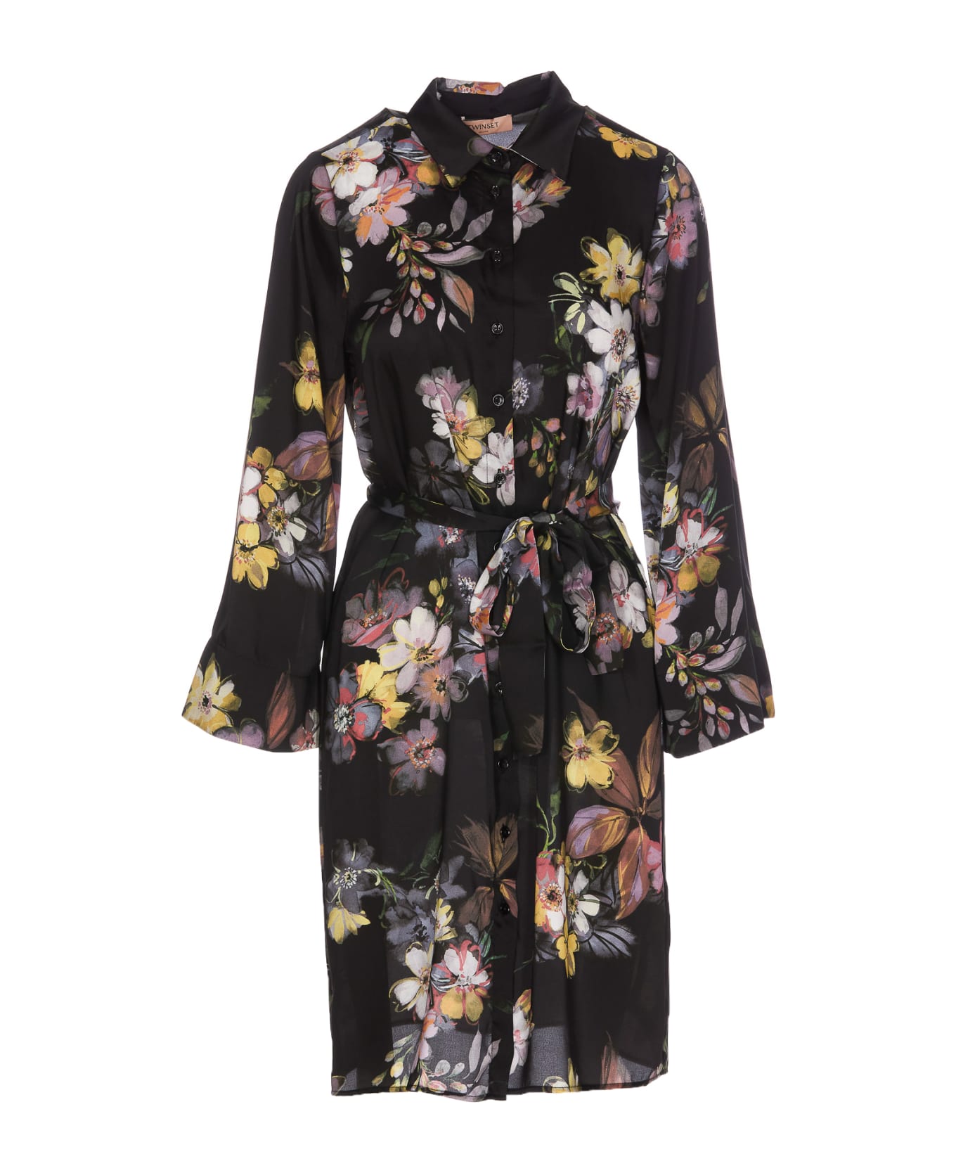 Twinset multicolor dress, floral print, frontal buttons closure, regular collar, long sleeves, belt detail on waist, long model Composition: 100% Polyester