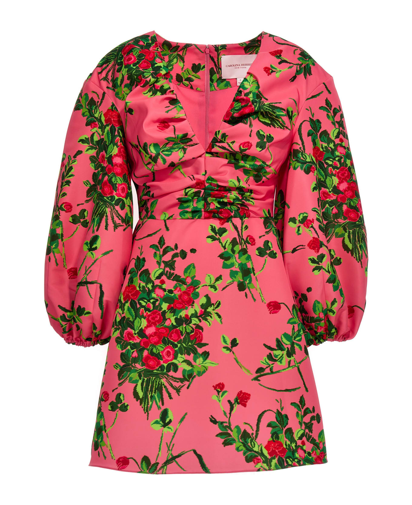 Short dress with all-over floral print, V-neck, back zip closure, long cuffed sleeves, elastic cuffs and draping on the chest.