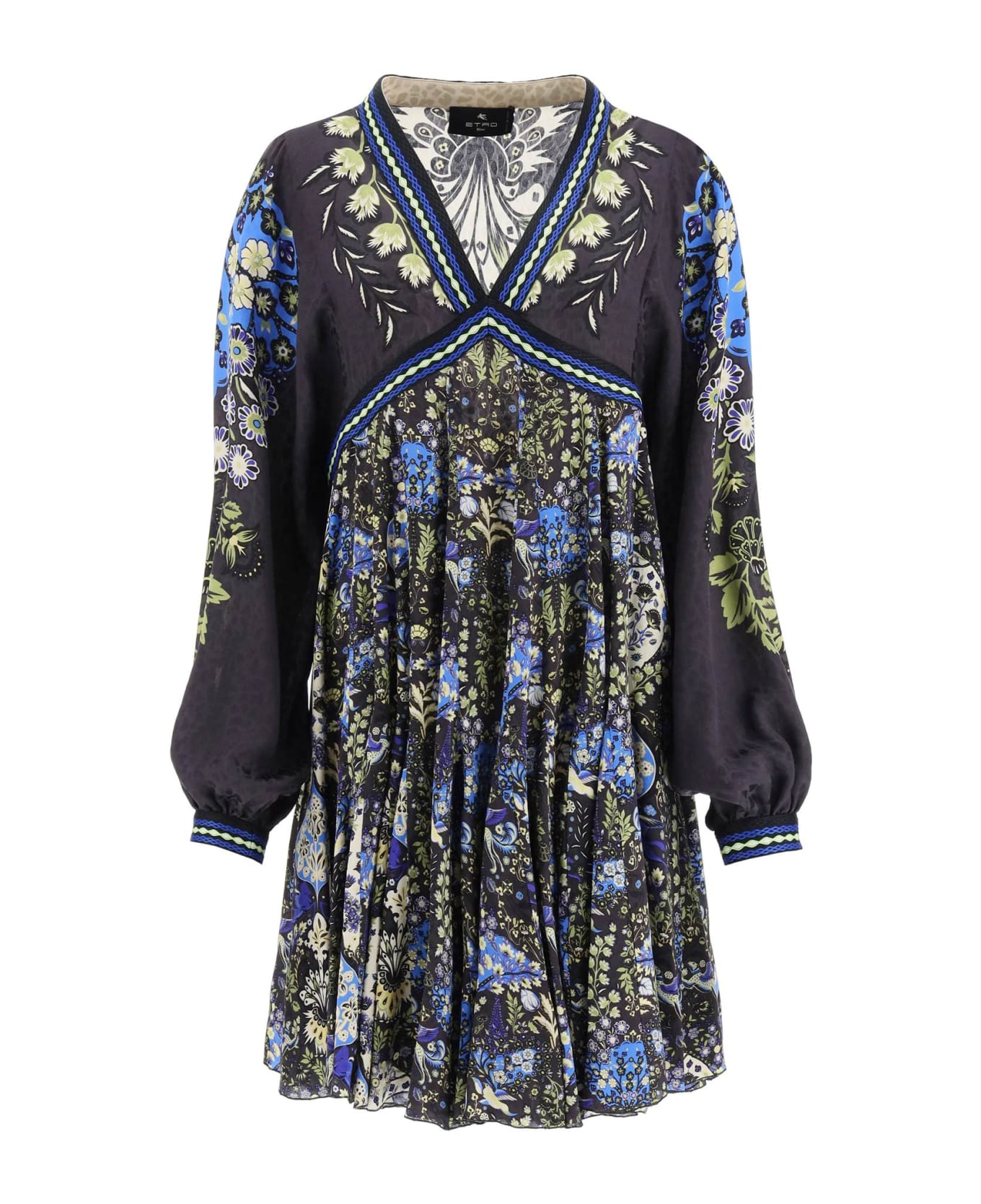 Etro tunic dress made of pure jacquard silk with floral motifs printed all over and ribbons detailed with geometric embroidery. Long-sleeve design with deep V-neckline and wide, fluted skirt with godet inserts. Unlined. The model is 177 cm tall and wears a size IT 40. Composition: 100%SE