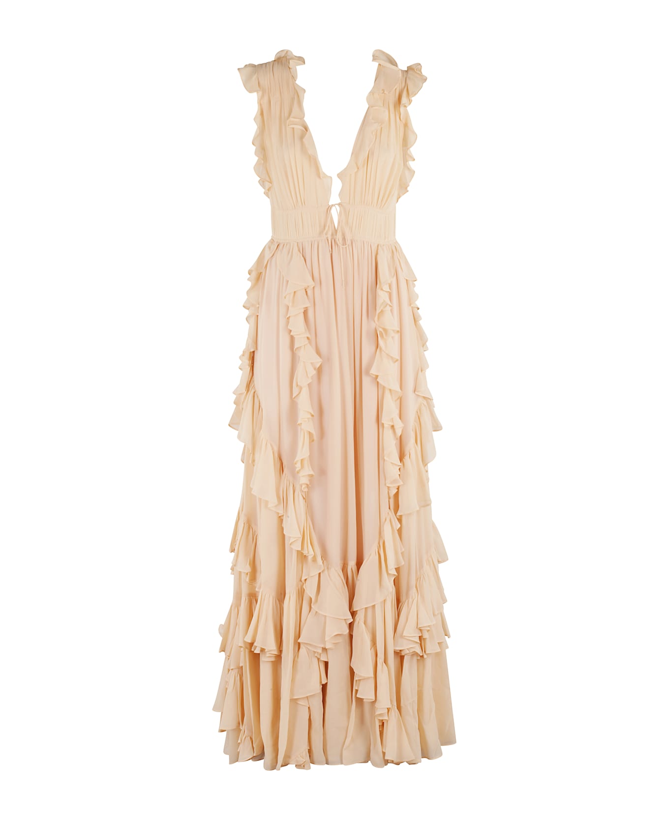 Florella dress - Ulla Johnson - Peony color - Silk georgette fabric - Wide V-neck with ruffles and drawstring - Back neckline with drawstring - Long flounced skirt with ruffles - Regular fit