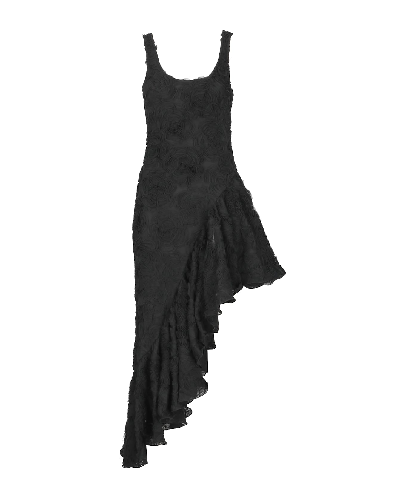 - Black Rotate dress for woman - Wide neck - Sleeveless - All-over roses details - Asymmetric hem