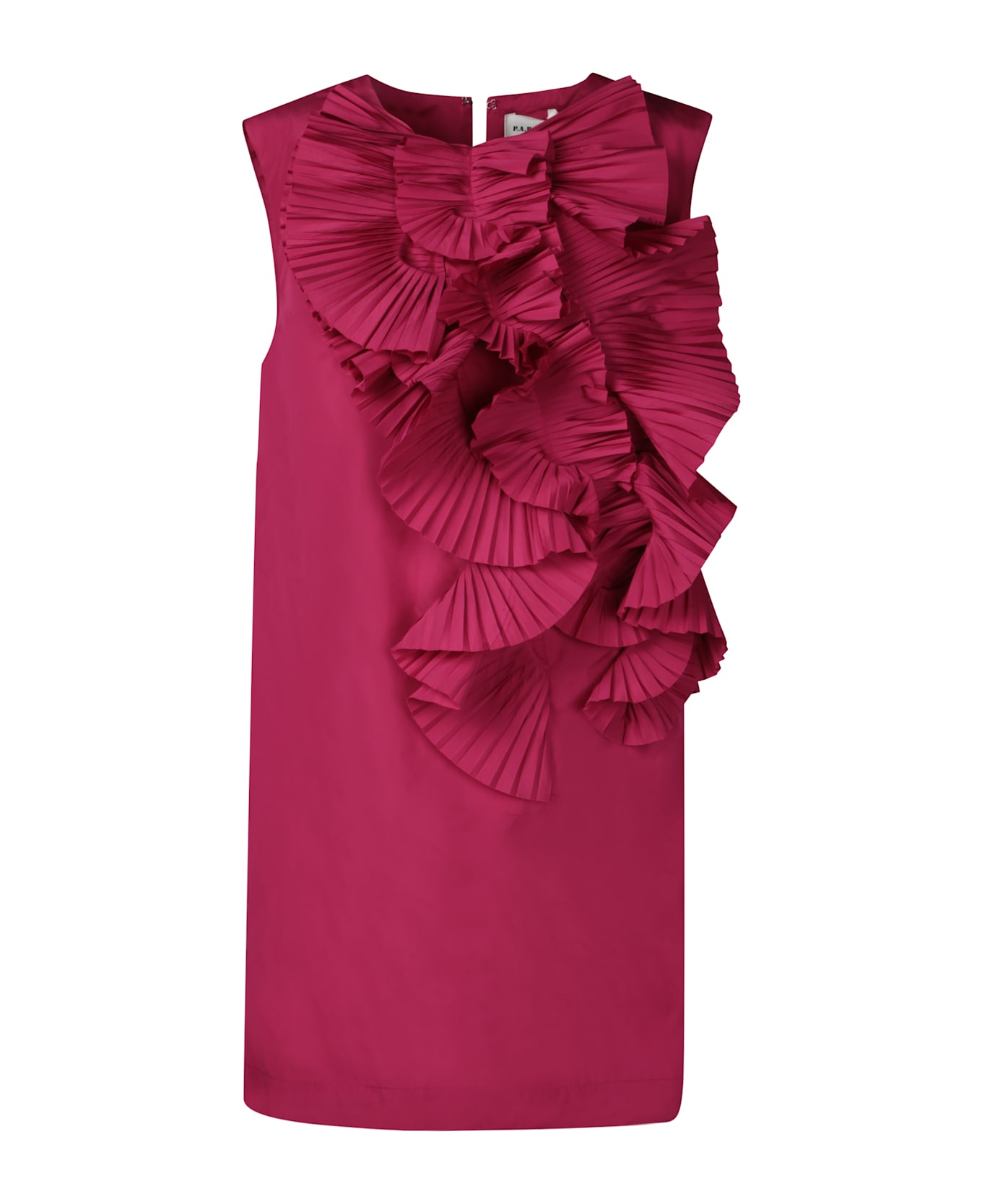 This fuchsia mini taffeta dress from PAROSH is perfect for special occasions. Artfully folded ruffles create a voluminous and dynamic appearance, evoking modern elegance.