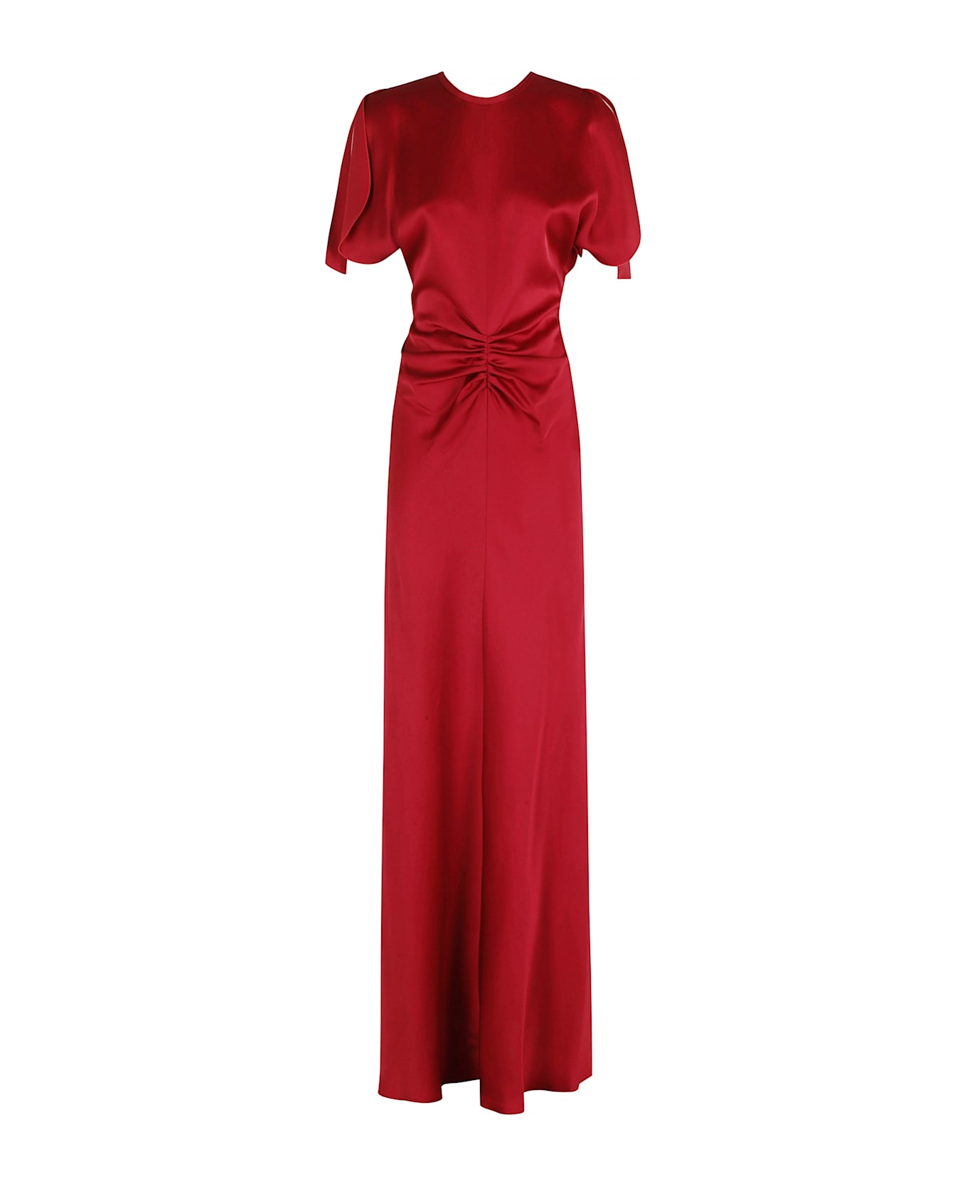 Long Dress - Victoria Beckham - red color - crepe satin - round neckline - v-back with concealed zipper - ruffle sleeves - front ruffle - long flowing skirt to floor length