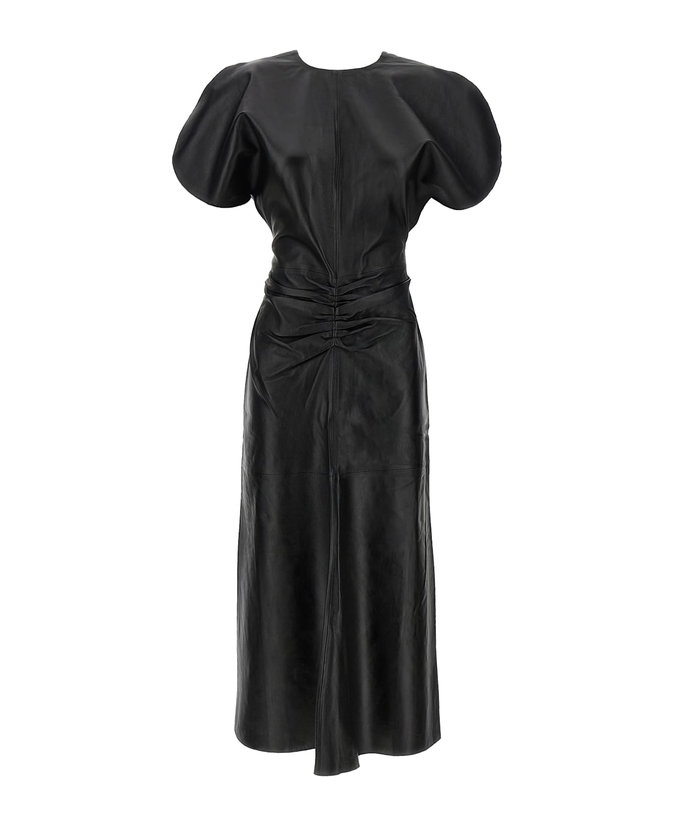 'Gathered Waist Midi' leather dress, crew neck, tight at the waist with front draped detail, slightly flared, short sleeves with ruffle-effect split, back zip closure.