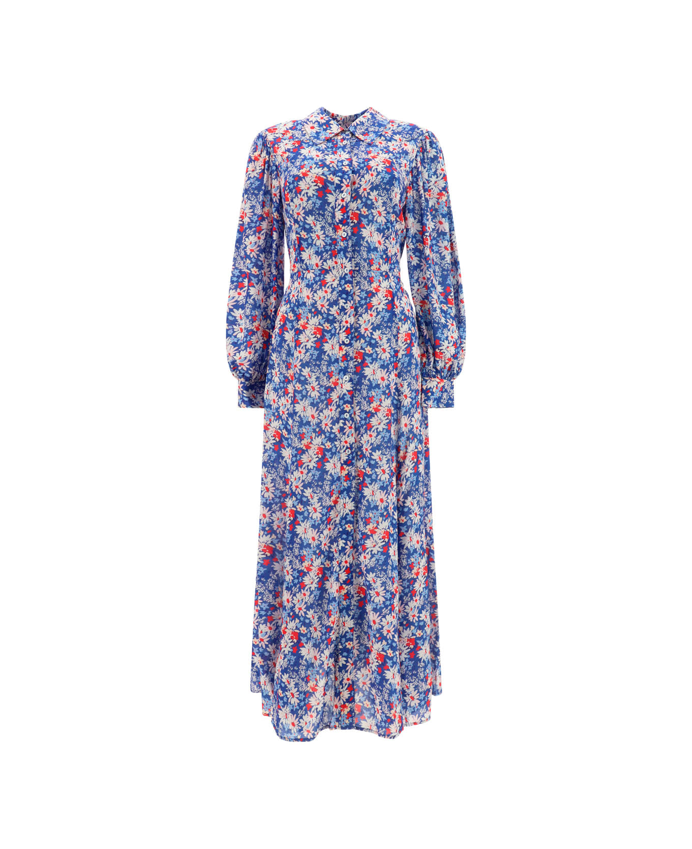 Georgina dress by rixo, v-neck front, classic collar, invisible zipper closure on side panel, midi length pattern, smocked back, empire style waist with ties, floral pattern, flounced skirt, loose silhouette. Composition: 100% % Viscose