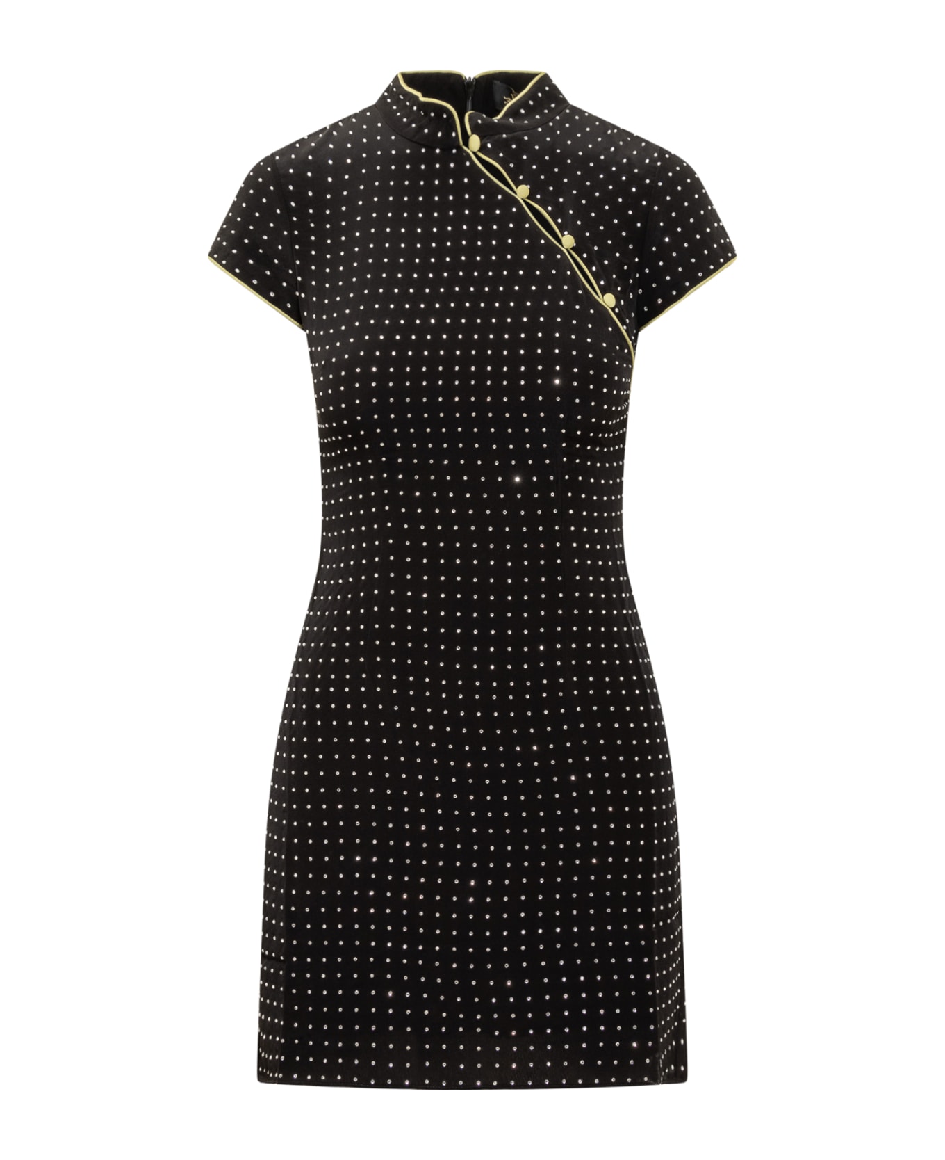 Short sleeves. Mini length. Fitted style. Contrasting booties. Ornate collar. Zip closure.