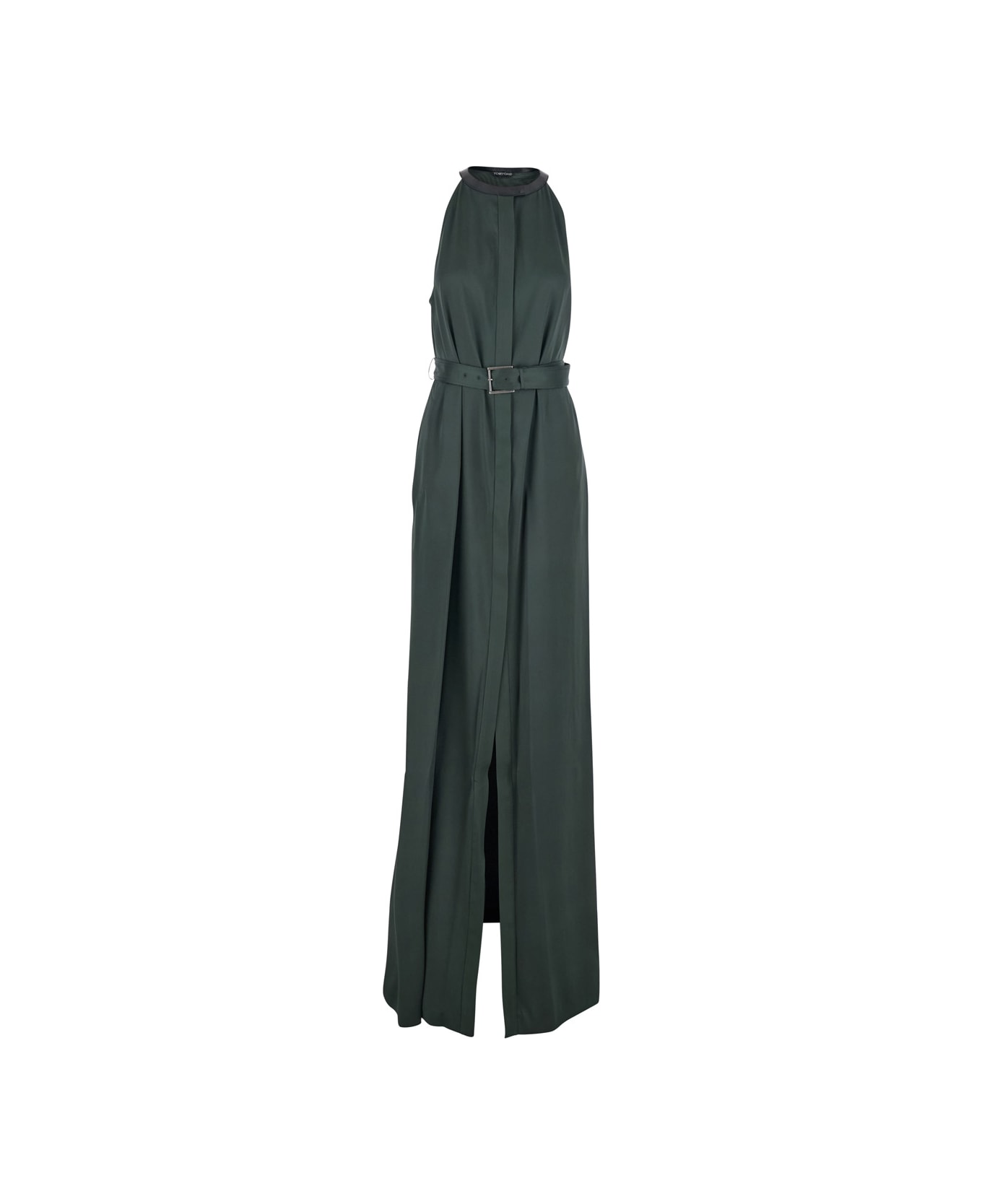 Long dress Green Halterneck Sleeveless Front concealed button closure Front belt Front single slit Straight hem Viscose blend Relaxed fit