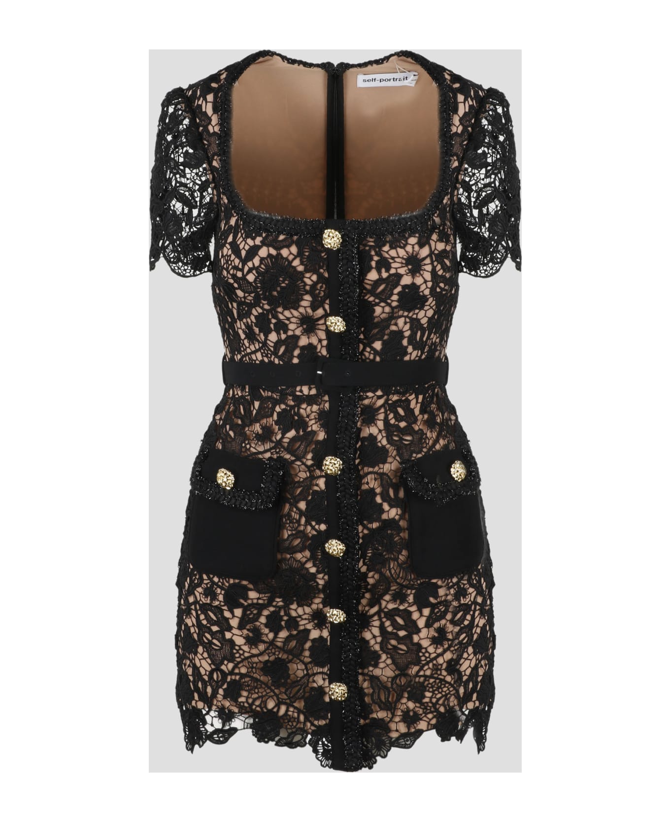 Self Portrait guipure lace mini dress. - SS23 - Slim fit - Square neckline - Short sleeves - Removable belt at the waist - Gold metal buttons - Patch pockets on the front - Lurex trims - Back zip and hook closure - Made in China - 100% Polyester