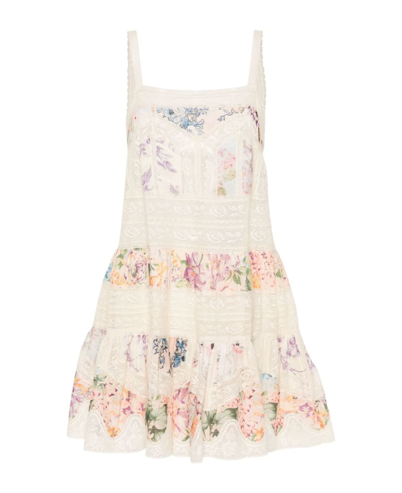 Halliday Lace Trim dress, beige/multicolor, cotton, all-over flower print, lace trim, ribbed details, semi-sheer inserts, square neckline, thin straps, flared cut, above-the-knee length, partial lining, peplum design, concealed back zipper closure