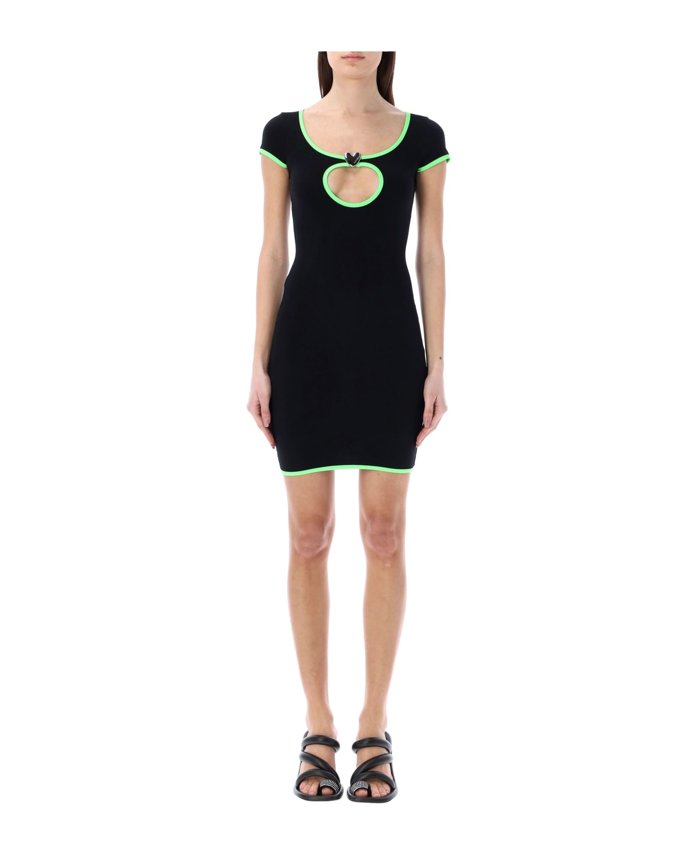 Stretch Viscose Heart Hole Dress By Ambush. Featuring: Scoop Neck Short Sleeves Front Cut-out Metal Heart With Engraved Logo Fitted Silhouette Green Piping Model Is 1,72 M Tall And She Is Wearing Size S